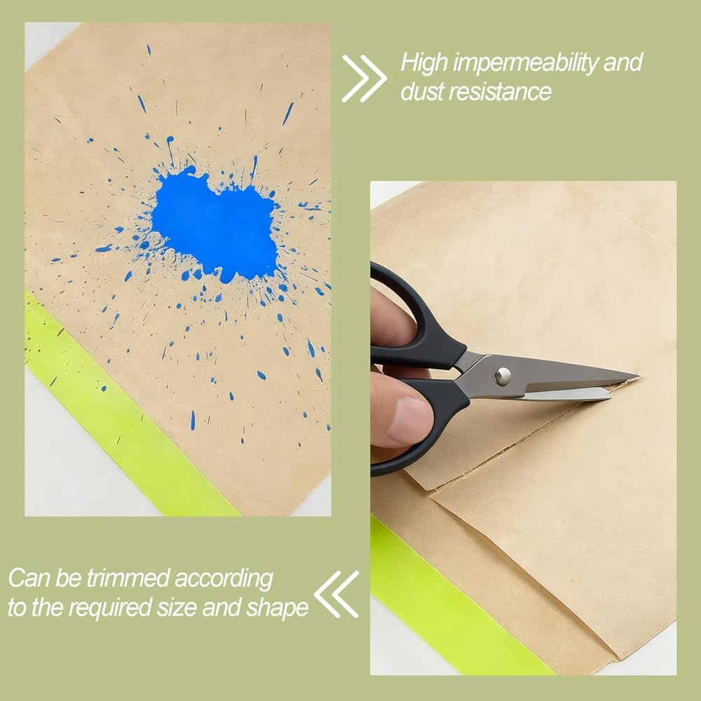 Strong, Non-absorbent: Our pre-taped painters paper is made of glazed brown kraft paper, it resists tearing and high penetration resistance, offers stronger protection than plastic masking film in house painting. You can cut plastic tape of different lengths according to different items.