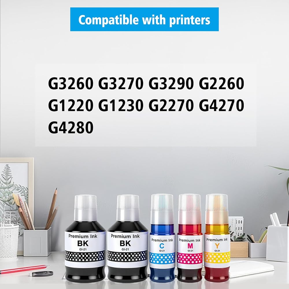 زجاجات حبر متوافقة GI-21 GI21 G3270 G3290 مكونة من 5 عبوات متعددة السعة عالية لطابعات Canon G3260 G2260 G1220 G1230 G2270 G4270 G4280 170 مل إعادة تعبئة الحبر الأسود 70 مل حبر C/M/Y