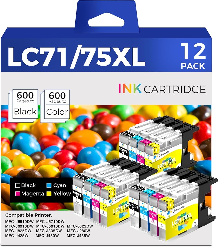 محتويات العبوة: إجمالي 12 عبوة من خراطيش حبر LC75XL/ LC71XL، 3x LC71XL/LC75XL حبر أسود، 3x LC71XL/LC75XL حبر سماوي، 1x LC71XL/LC75XL حبر أرجواني، 1x LC71XL/LC75XL حبر أصفر. يتم تعبئة كل خرطوشة حبر LC71XL/LC75XL بشكل مستقل لضمان عدم تسرب الحبر أو تلف المنتج.