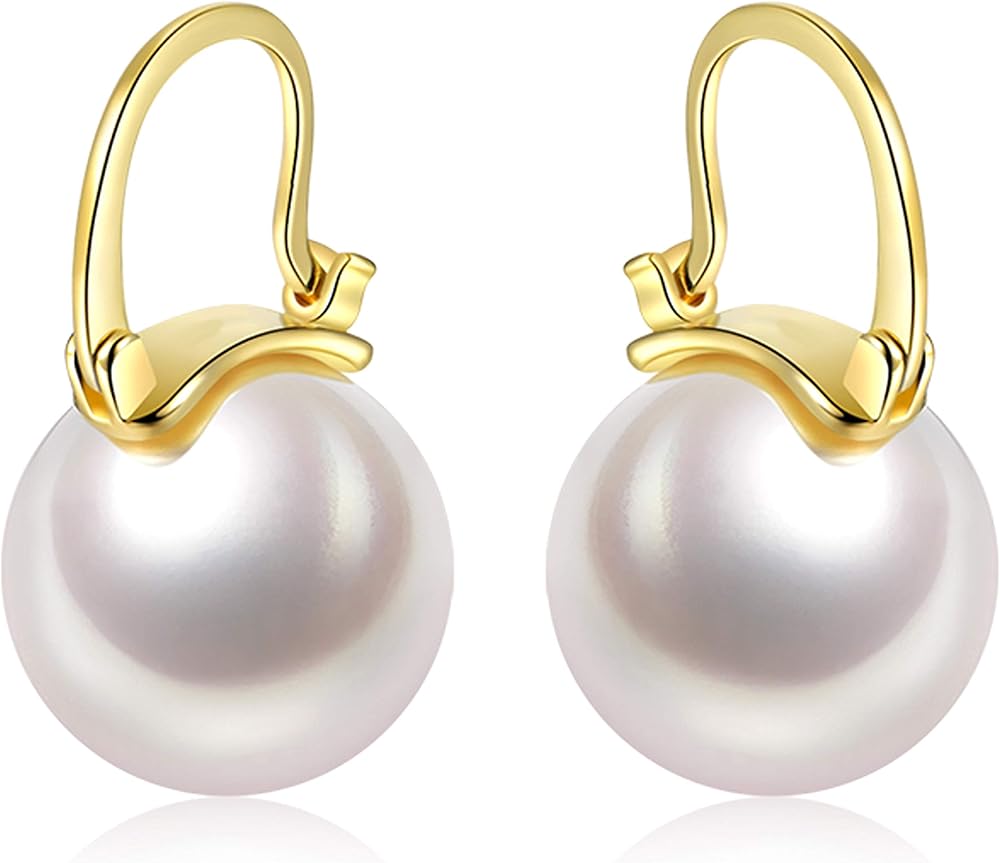 أقراط متدلية من الفضة الإسترليني عيار 14 قيراط مطلية بالذهب عيار 925 مقاس 14 ملم بيضاء مستديرة من اللؤلؤ للنساء أقراط متدلية خفيفة الوزن لمجوهرات الزفاف البسيطة لمجوهرات عيد الميلاد مطلية بالذهب والفضة