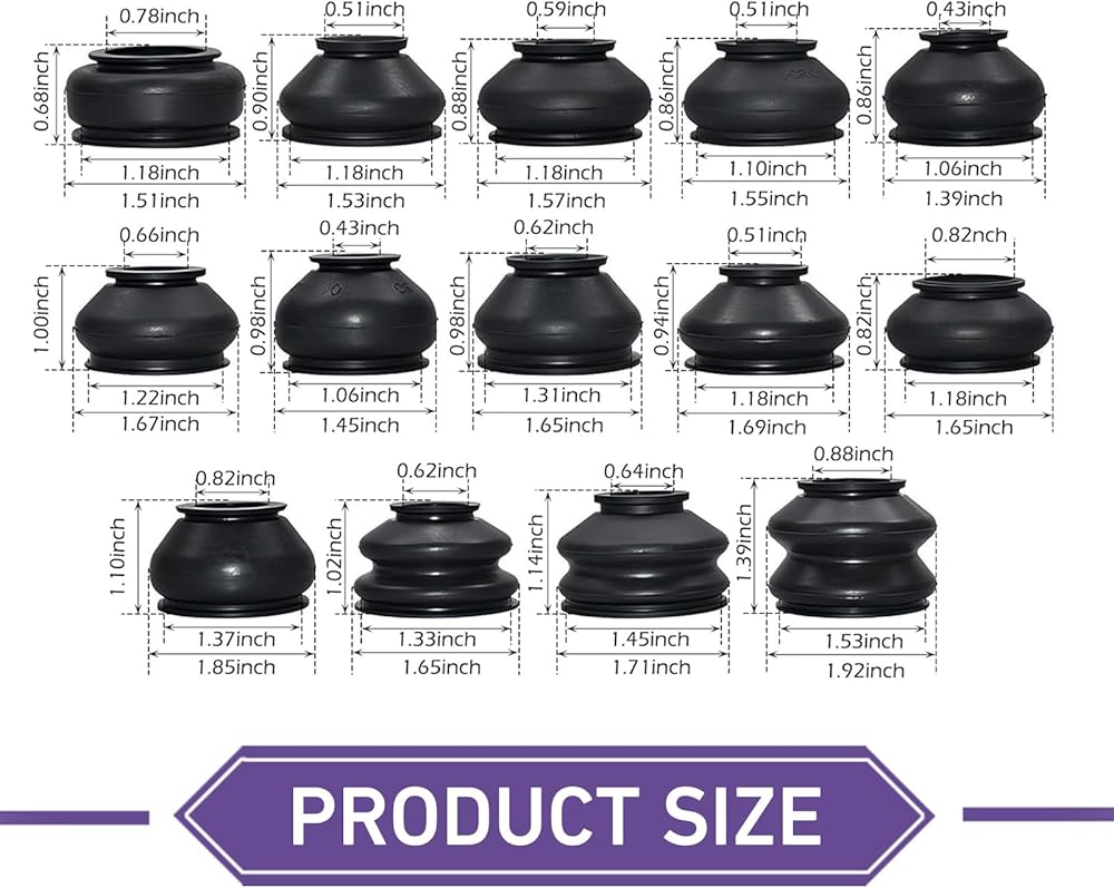 3.You will get 14 x tie rod boots, there are 14 different specifications, which can meet most of the installation needs, improve steering precision and driving safety.
