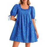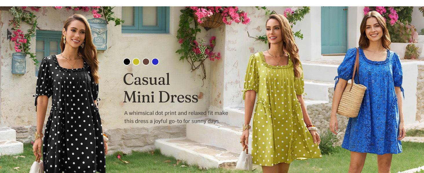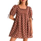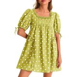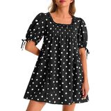 تصميم الفستان: قصة بيبي دول رائعة ذات شكل كبير، ورقبة مربعة، وأكمام قصيرة منتفخة، وتصميم مطوي رقيق لمزيد من الحجم والسحر. لمسة نهائية بنمط منقط وجيوب جانبية عملية.
