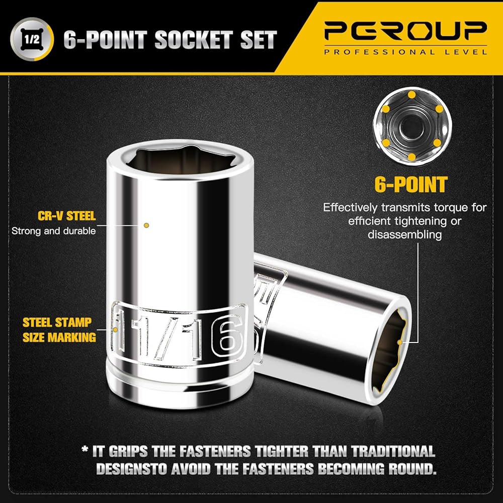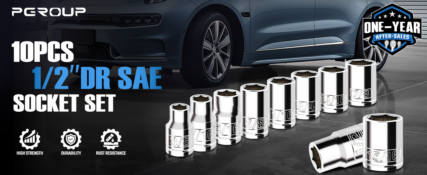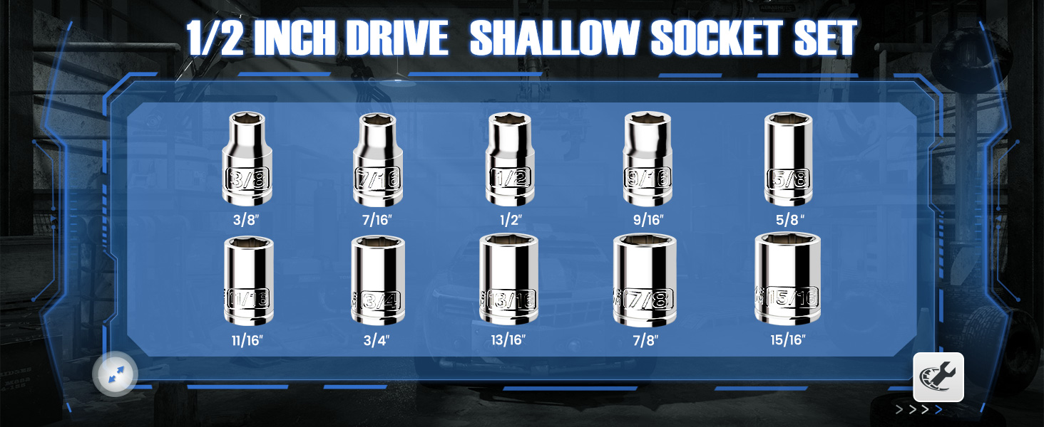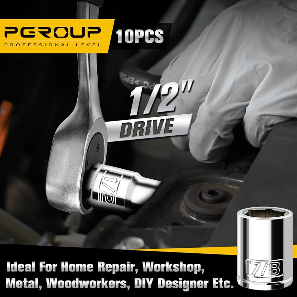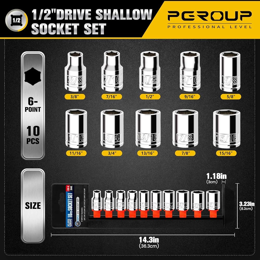 مجموعة مقابس ضحلة للمحرك 10 قطع مقاس 1/2 بوصة، SAE (3/8 بوصة - 15/16 بوصة)، 6 نقاط، فولاذ Cr-V، مقبس مطلي بالكروم المصقول بالكامل مع دعامة تعليق، غطاء الأحجام الأكثر شيوعًا