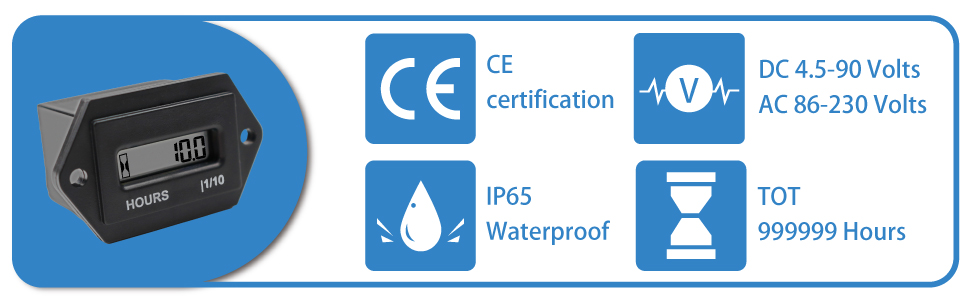 ✅ قياس دقيق: نطاق قياس واسع (من 0 إلى 999,999 ساعة)؛ دقة عالية (0.1 ساعة). قياس وقت تشغيل المحركات والآلات بدقة.
