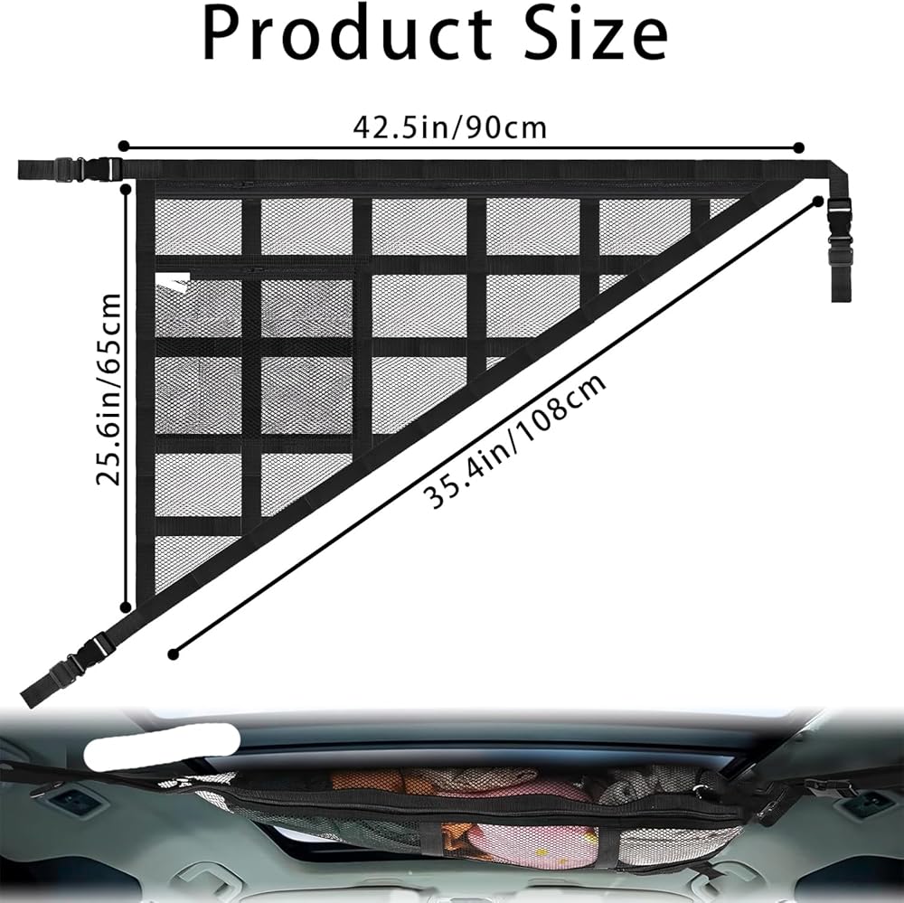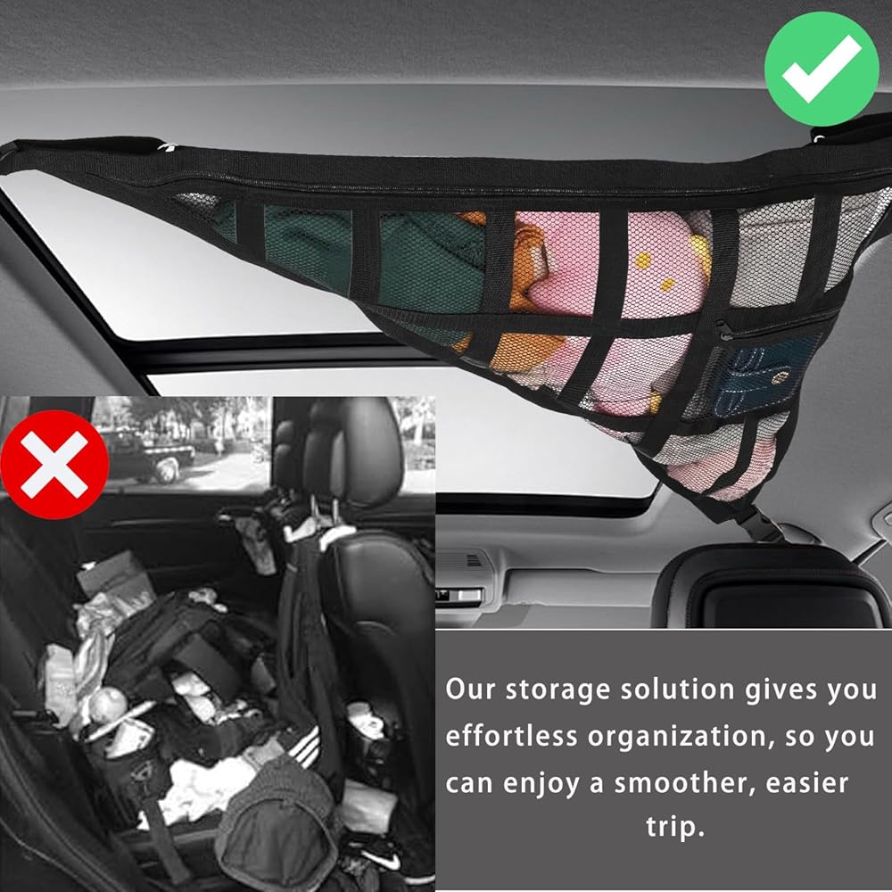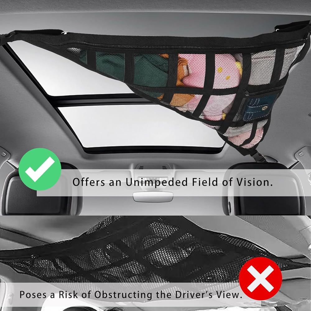 Our upgraded SUV ceiling storage net pocket is ideal for stowing lightweight items such as baby blankets, children's toys, and tissues. The transparent mesh design allows you to quickly locate your belongings without the hassle of rummaging through the trunk.