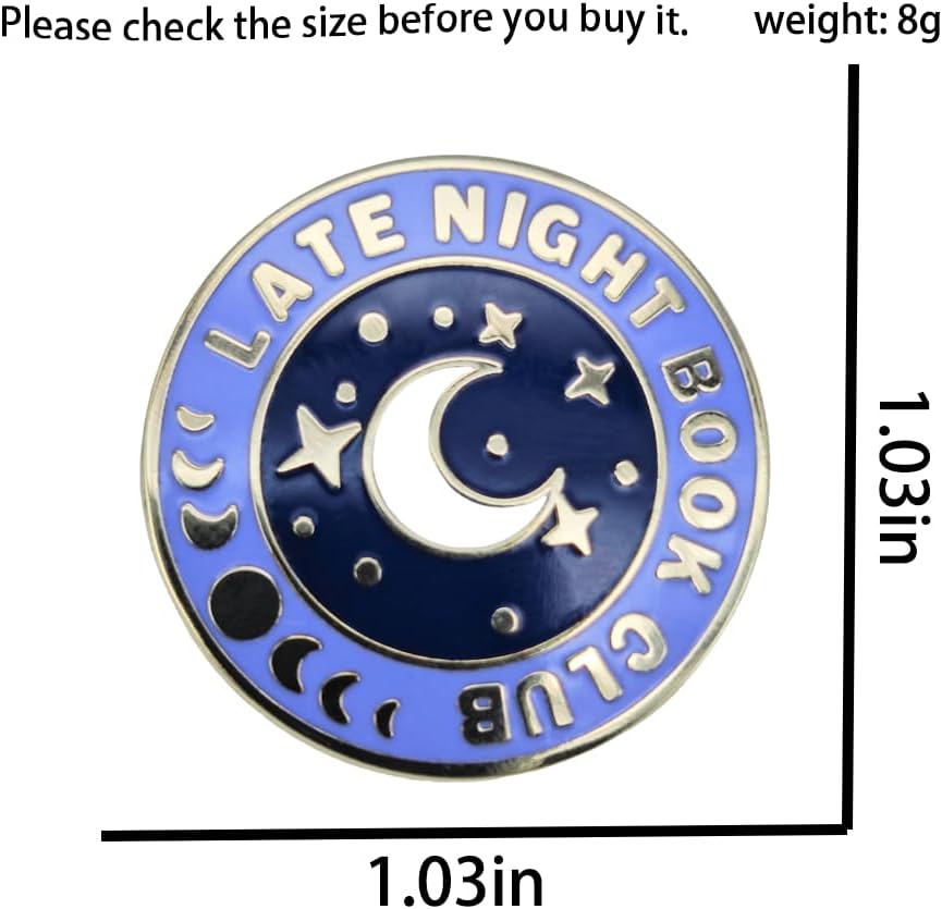 Embrace your love for nighttime reading with this charming enamel pin featuring a dreamy celestial design. The circular badge showcases a beautiful night sky scene with a crescent moon and twinkling stars set against a deep navy background, encircled by a purple border with moon phase details. This sophisticated lapel pin makes a perfect accessory for book lovers, night owls, and anyone who cherishes quiet evening moments with their favorite stories. The gold-tone metal accents add an elegant touch to the design, making it a delightful addition to any jacket, bag, or collection of literary-themed accessories. Whether you're treating yourself or searching for a thoughtful gift for fellow readers, this pin celebrates the magical combination of books and starlit nights. The pin's durable enamel construction ensures it will remain a treasured piece in your jewelry collection for years to come.