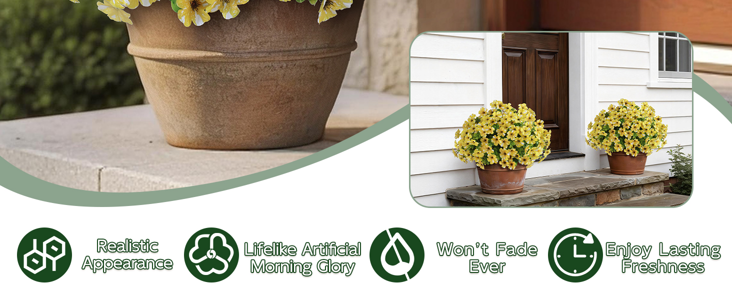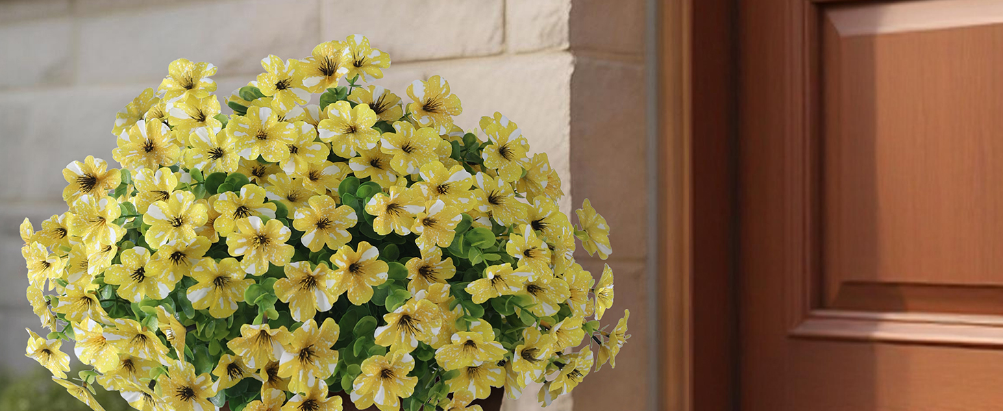 【ديكور داخلي وخارجي】: تتميز هذه الزهور الصناعية الخارجية بمظهر واقعي وهي ديكورات مثالية لأواني الزهور والمزهريات والحدائق والساحات والشرفات والأبواب الأمامية والشرفات والنوافذ والمنازل وبيوت المزرعة وما إلى ذلك. إنها مناسبة للاستخدام الداخلي والخارجي.