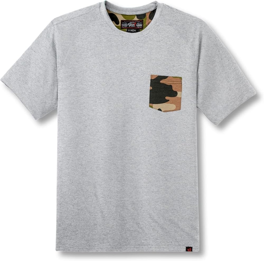 جيب مموه ملفت للنظر: ارفع أناقتك مع التي شيرت الرمادي قصير الأكمام الذي يتميز بجيب مموه فريد من نوعه، مما يدلي ببيان مع الحفاظ على الأساسيات قريبة.