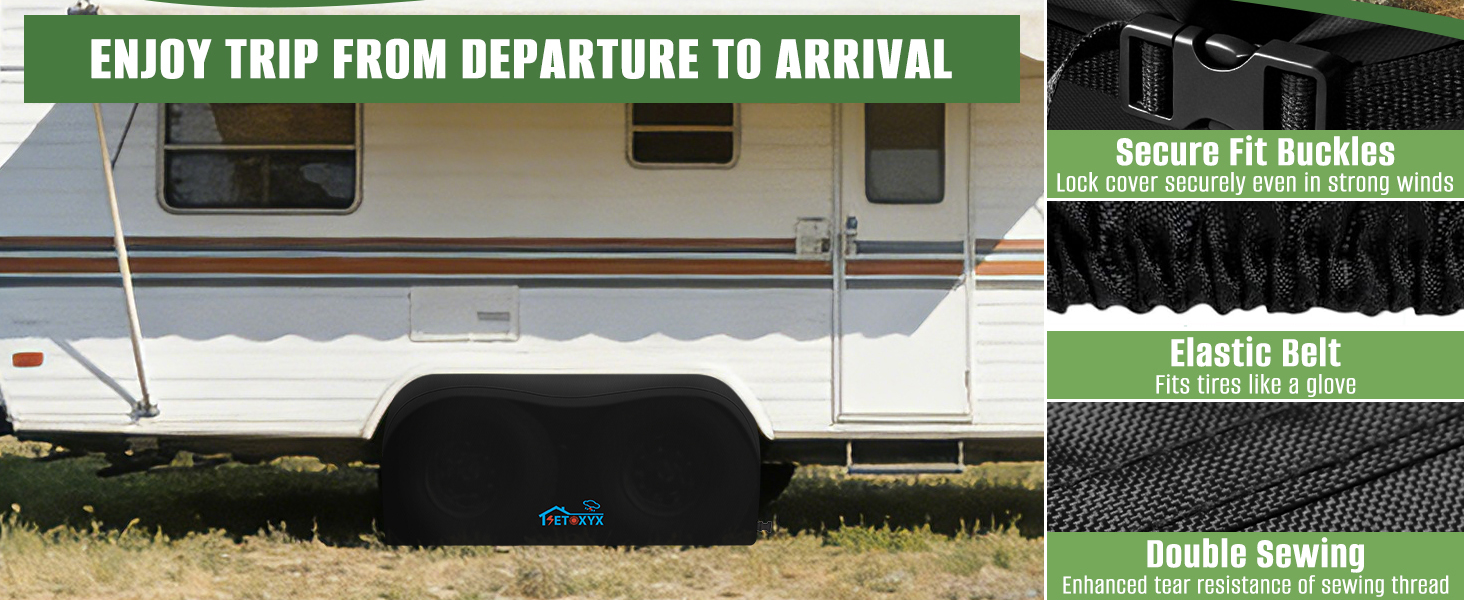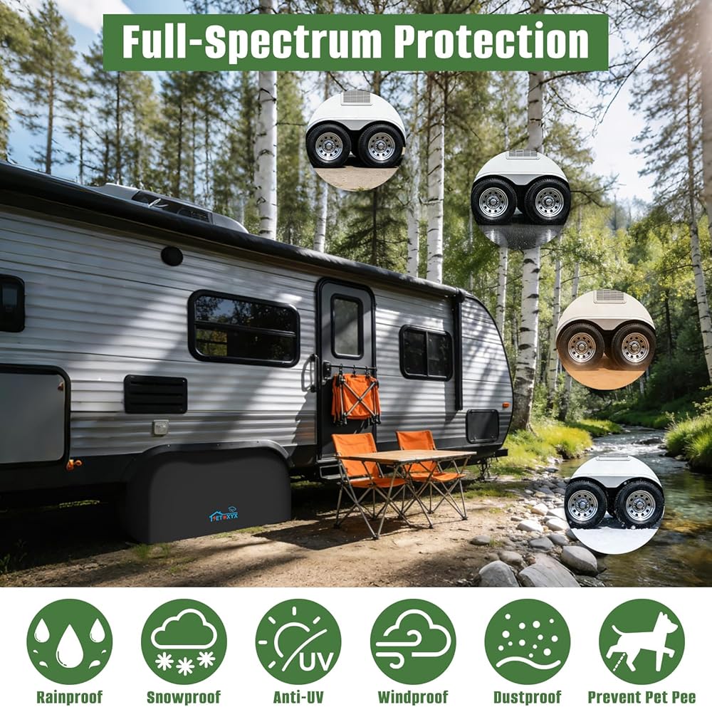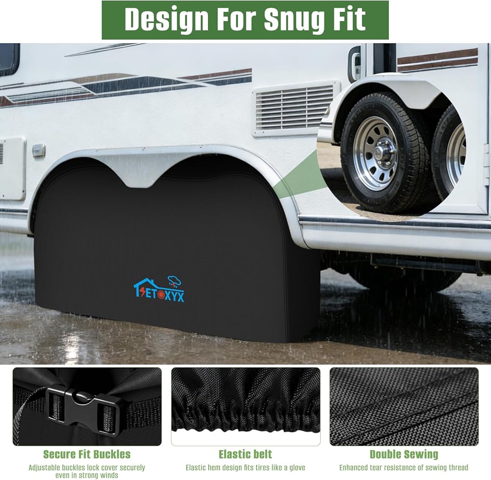 تصميم ملائم مقاوم للرياح: مزود بحاشية خلفية مرنة وأشرطة بإبزيم قابلة للتعديل، بالإضافة إلى درزات مزدوجة لتعزيز المتانة. يتم تثبيت الأغطية بإحكام على العجلات ذات المحور المزدوج حتى في الرياح القوية والطقس القاسي، مما يضمن عدم الانزلاق أو التمزق أثناء التخزين أو النقل على المدى الطويل.