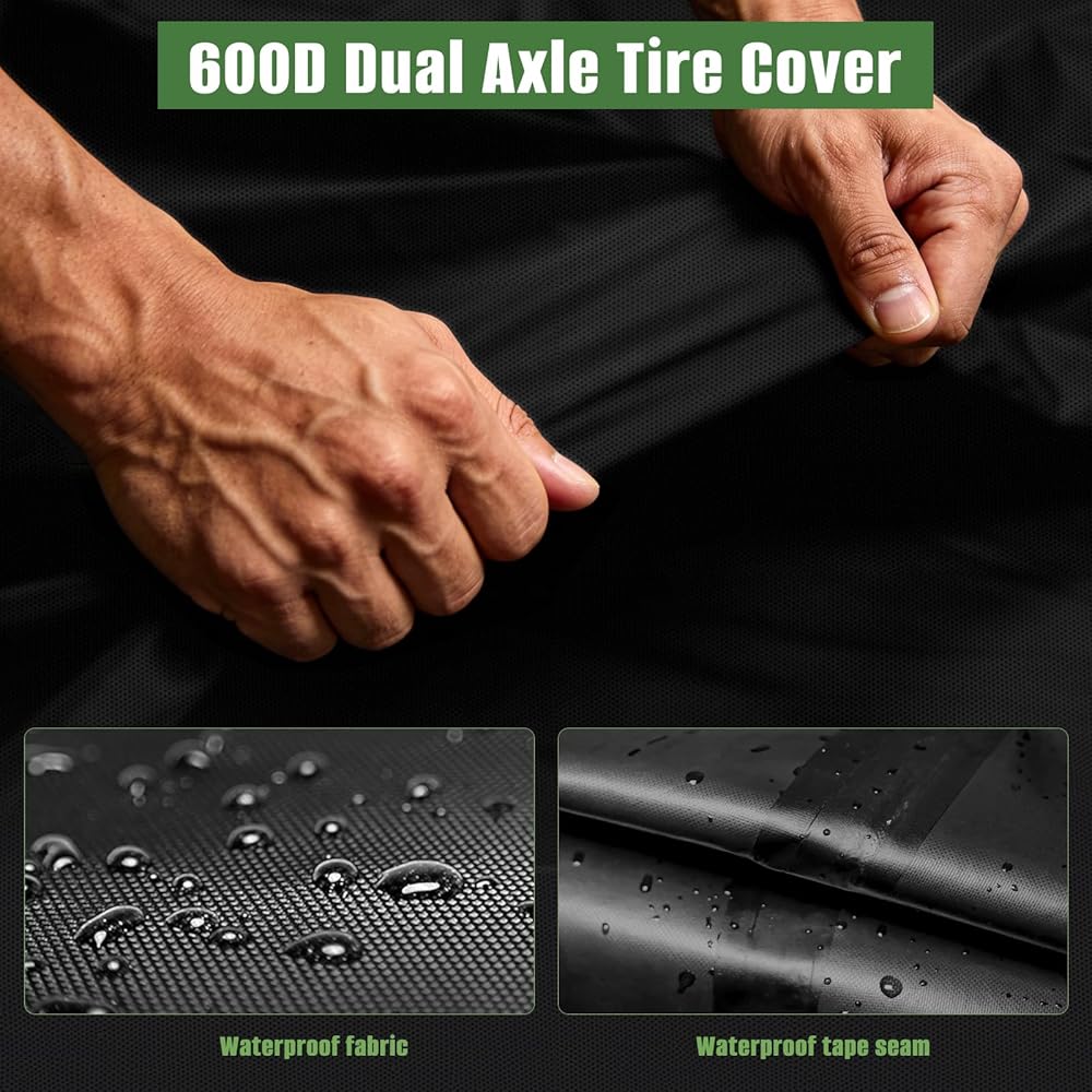 نسيج 600D عالي التحمل: مصنوع من قماش أكسفورد عالي الكثافة 600D مع البولي يوريثان، أغطية إطارات RV مقاومة للماء بالكامل، ومقاومة للأشعة فوق البنفسجية، ومقاومة للخدش والبهتان. يمكنها تحمل سنوات عديدة من التعرض للخارج، وتحمي الإطارات بشكل فعال من الشمس والمطر والثلج والغبار والتآكل لمنع التعفن الجاف وتشقق الجدران الجانبية وصدأ العجلات.