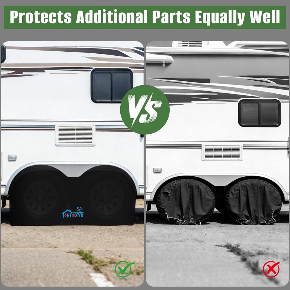 الحماية الكاملة: حل وقائي مثالي لمجموعة واسعة من المركبات ذات أحجام الإطارات المطابقة. إنها مثالية للشاحنات والمقطورات والمعسكرات وبيوت السيارات والمركبات الترفيهية على حد سواء. سواء كنت تقوم بتخزين سيارتك في الممر، أو ركنها في موقع تخييم، أو الاحتفاظ بها في مخزن طويل الأمد، فإن هذه الأغطية توفر دفاعًا موثوقًا به في جميع الأحوال الجوية.
