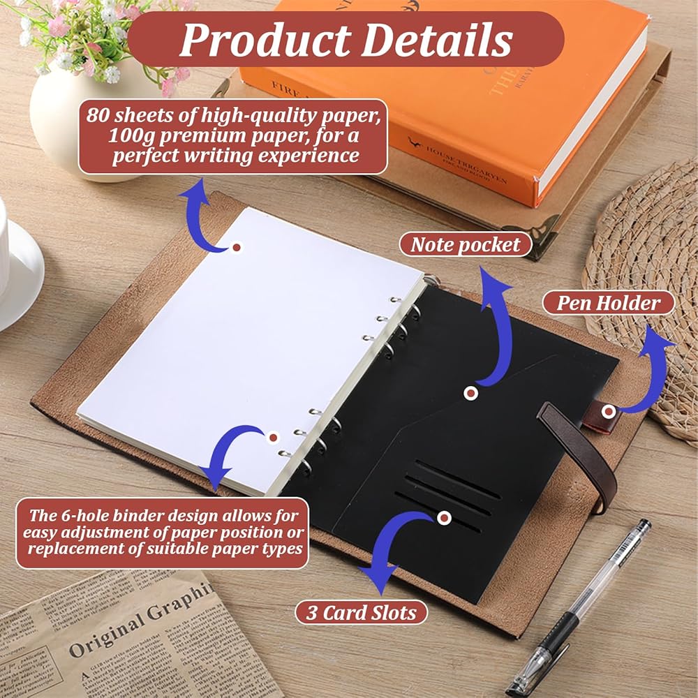 Sturdy 6-Ring Mechanism & User-Friendly Details: The 6-ring binder ensures reliable page hold and easy opening/closing; the notebook lays flat when open for comfortable writing (no awkward folding). Reinforced stitching boosts durability, and the ready-to-use 160-page paper lets you start creating immediately—versatile for planners, sketchbooks, or budget trackers