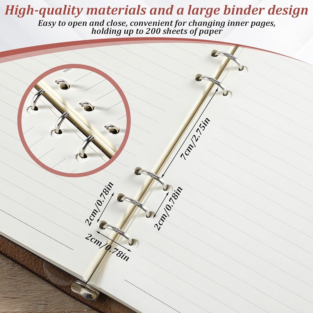 Exact A5 Dimensions for Universal Compatibility: Overall product size: 17.2×22.7×2.4cm (6.77×8.94×0.94 inches); A5 inner page size: 143×209mm (5.63×8.23 inches), fitting standard A5 6-hole refill paper. The sturdy metal 6-ring binder securely holds pages (prevents falling off) and accommodates extra sheets, making it ideal for long-term note-taking or planning