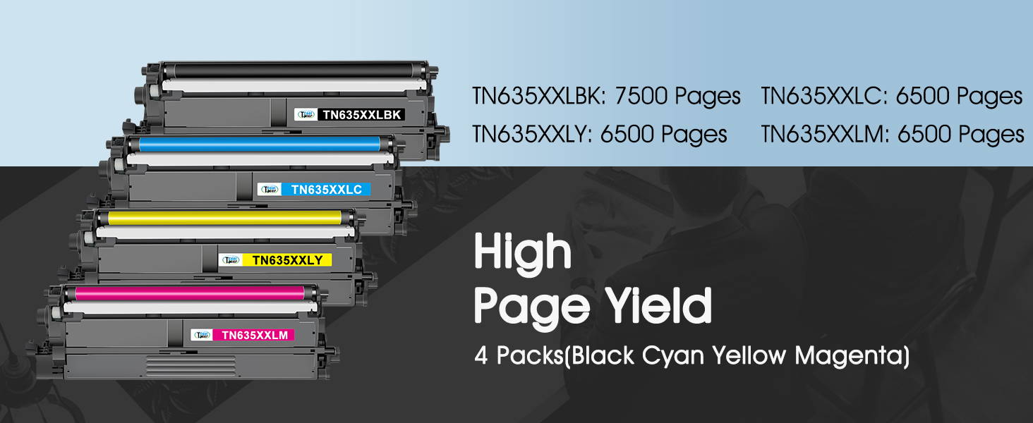 إنتاجية عالية للصفحة: ما يصل إلى 7500 صفحة لكل خرطوشة حبر TN635XXLBK (الحرف A4، بتغطية 5%)، ما يصل إلى 6500 صفحة لكل خرطوشة حبر TN635XXLC TN635XXLM TN635XXLY (الحرف A4، بتغطية 5%)