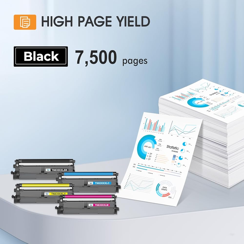 محتويات العبوة: 1 × حبر أسود TN635XXLBK، 1 × حبر سماوي TN635XXLC، 1 × حبر أرجواني TN635XXLM، 1 × حبر TN635XXLY أصفر