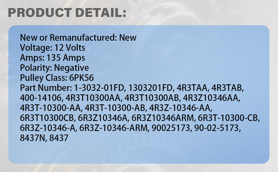 {رقم الجزء}: 1-3032-01FD، 1303201FD، 4R3TAA، 4R3TAB، 400-14106، 4R3T10300AA، 4R3T10300AB، 4R3Z10346AA، 4R3T-10300-AA، 4R3T-10300-AB، 4R3Z-10346-AA، 6R3T10300CB، 6R3Z10346A، 6R3Z10346ARM، 6R3T-10300-CB، 6R3Z-10346-A، 6R3Z-10346-ARM، 90025173، 90-02-5173، 8437 ن، 8437