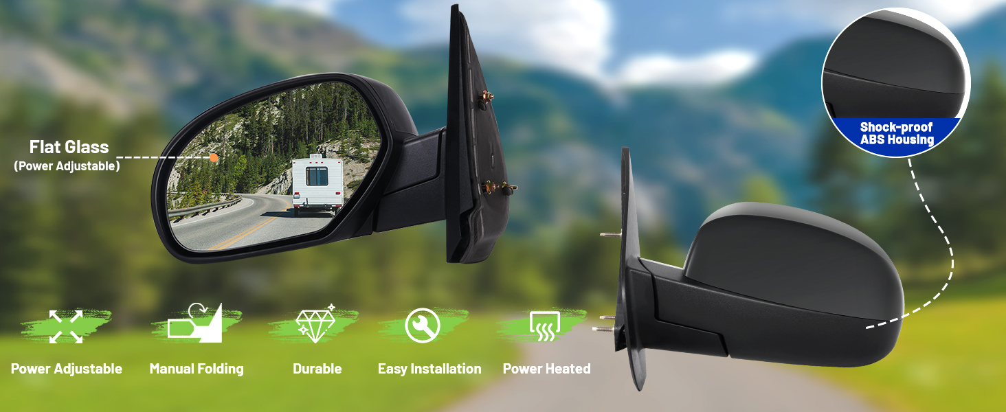 رؤية محسنة: توفر المرايا الخارجية للسيارات تصميمًا زجاجيًا واسع الزاوية للمرايا يعزز الرؤية الخلفية، ويقلل البقع العمياء ويحسن سلامة القيادة بشكل عام. ضروري لمرايا السحب المستخدمة أثناء عمليات القطر