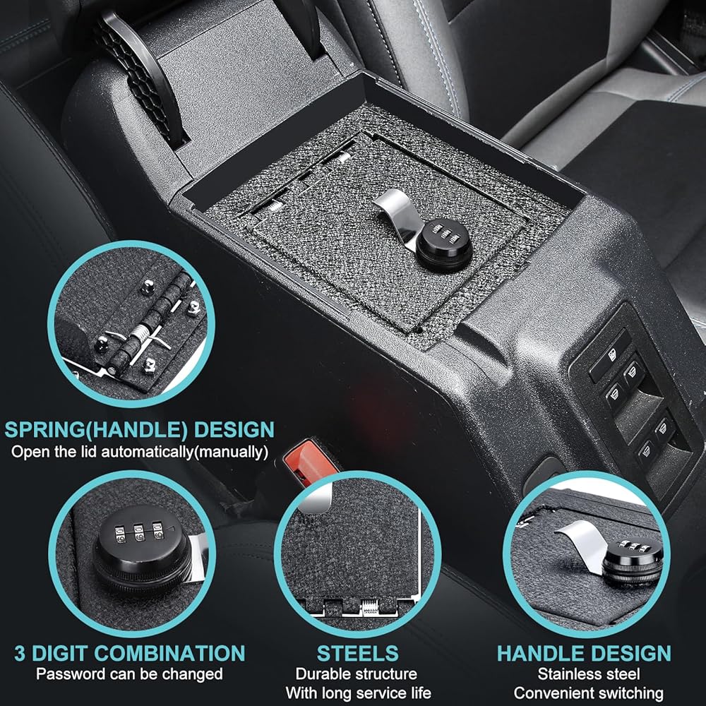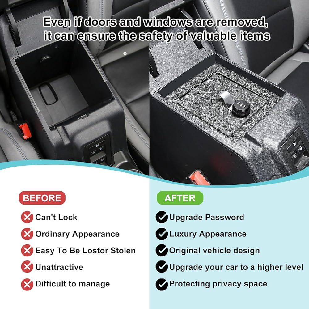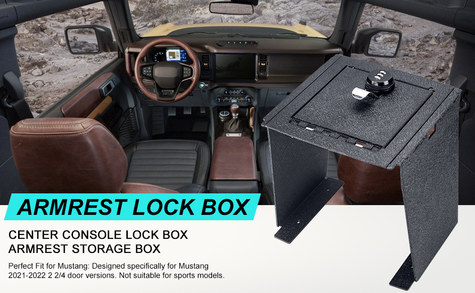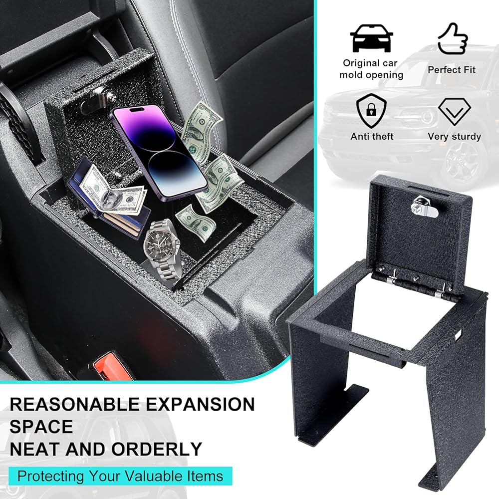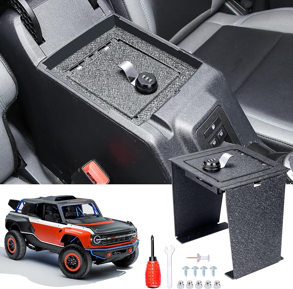 صندوق آمن لوحدة التحكم المركزية - صندوق منظم آمن مضاد للسرقة متوافق مع 2021 2022 2023 Ford Bronco 2/4 باب قفل مسند ذراع وحدة التحكم المركزية مع قفل كلمة مرور كومبو مكون من 3 أرقام