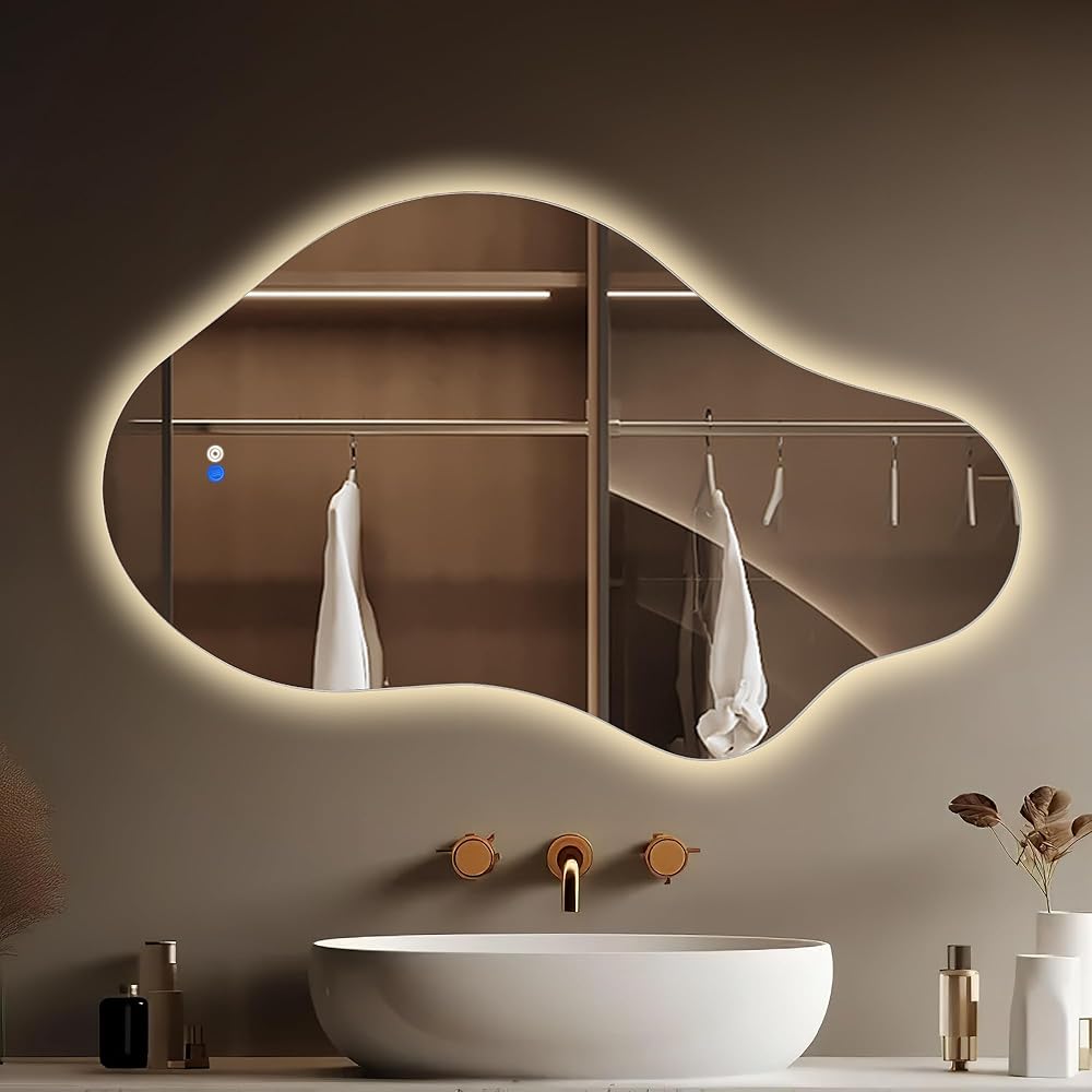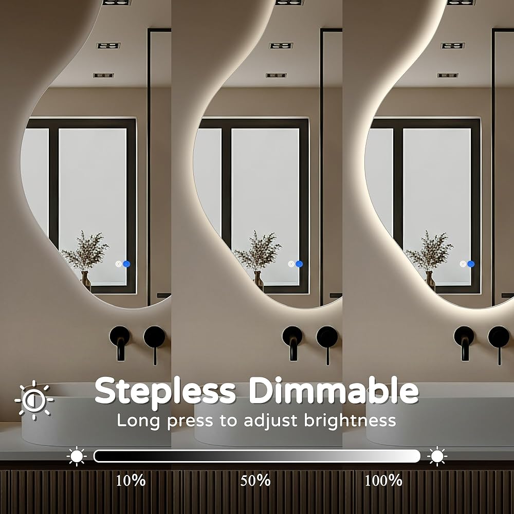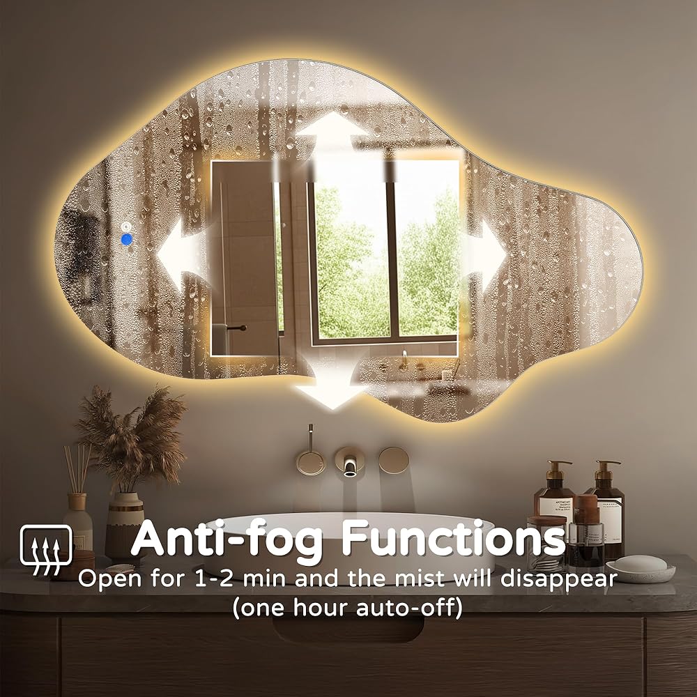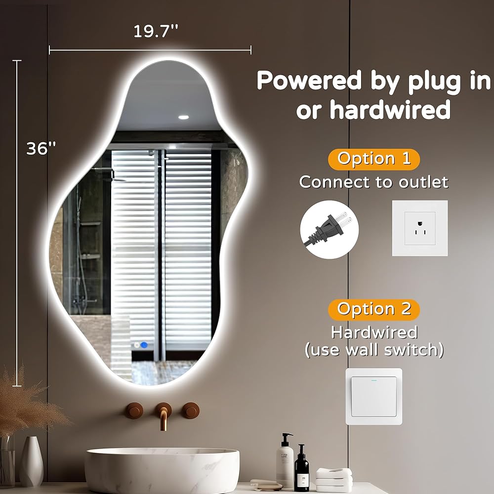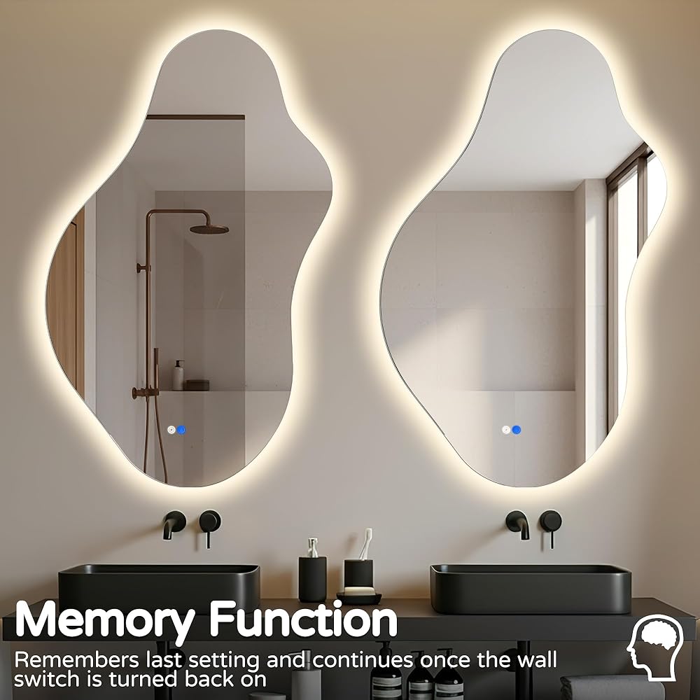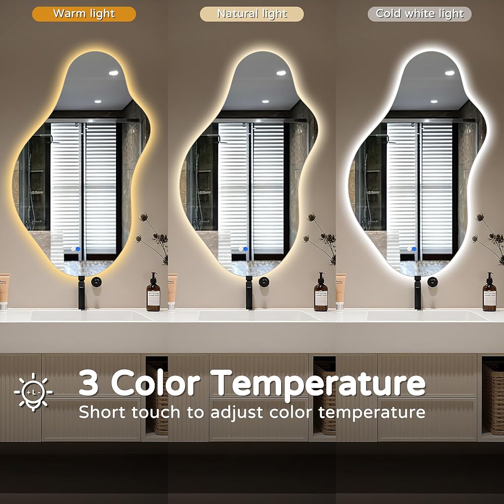 مرآة حمام LED غير منتظمة مع أضواء، مرآة زينة LED غير متناظرة مقاس 20 × 36 بوصة للجدار، مرآة ذكية بدون إطار مضادة للضباب، 3 ألوان وإضاءة خافتة، أفقية/عمودية