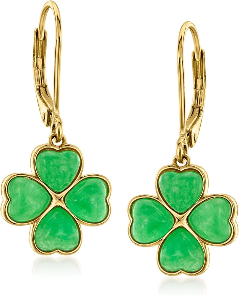 Established in 1952, Ross-Simons brings jewelry classics into the modern era. Vibrant color and positive symbolism make this pair a lucky find! Our splashy four-leaf clover drop earrings are comprised of 5x5mm heart-shaped jade cabochons set in polished 18kt yellow gold over sterling silver. Length is 1 1/8". Leverback, jade four-leaf clover drop earrings.