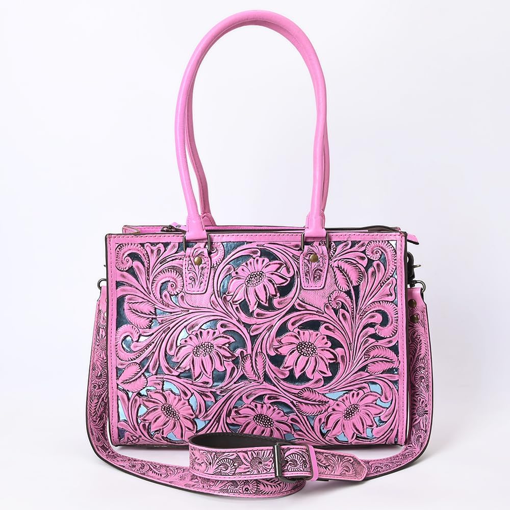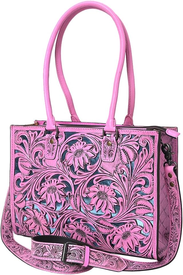 خامة عالية الجودة: - مصنوعة من جلد أصلي محبب بالكامل تم تصميمه يدويًا بعمق على السطح بالكامل ومصبوغ بلون وردي نابض بالحياة. تم تصميم الهيكل القوي والمقابض المتينة لحمل مريح يدوم طويلاً أثناء التنقل اليومي.