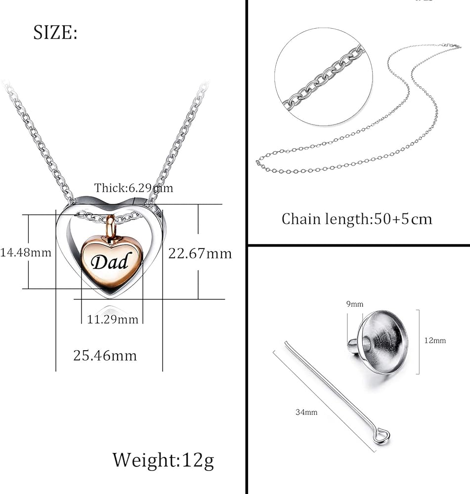 قلادة قلب مزدوج: هدية خاصة لعائلتك وأصدقائك لتقدير أحبائهم. يمكنك تخزين كمية صغيرة من الشعر والحرق والرماد والزهور المجففة والغبار والمعلومات الخاصة وغيرها من الأشياء التي تريد حفظها