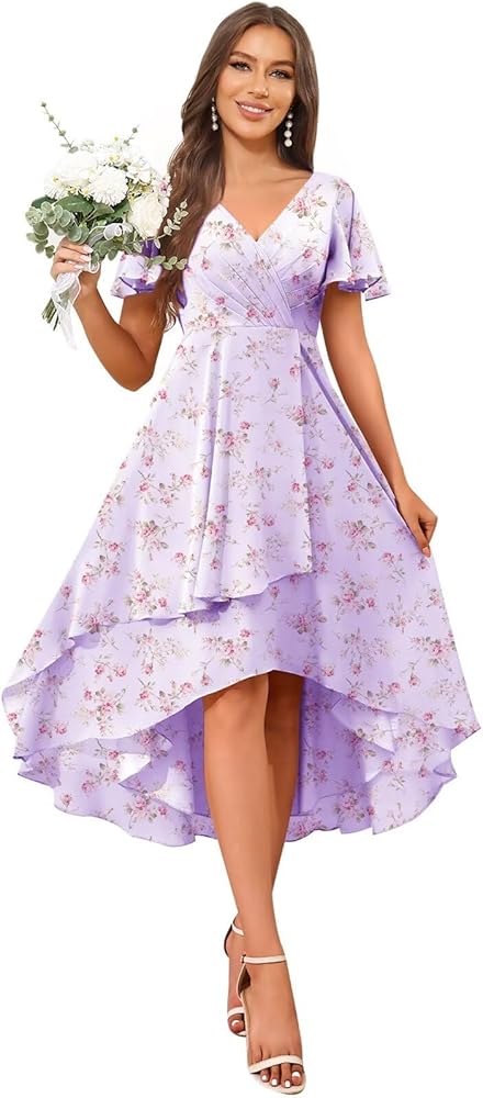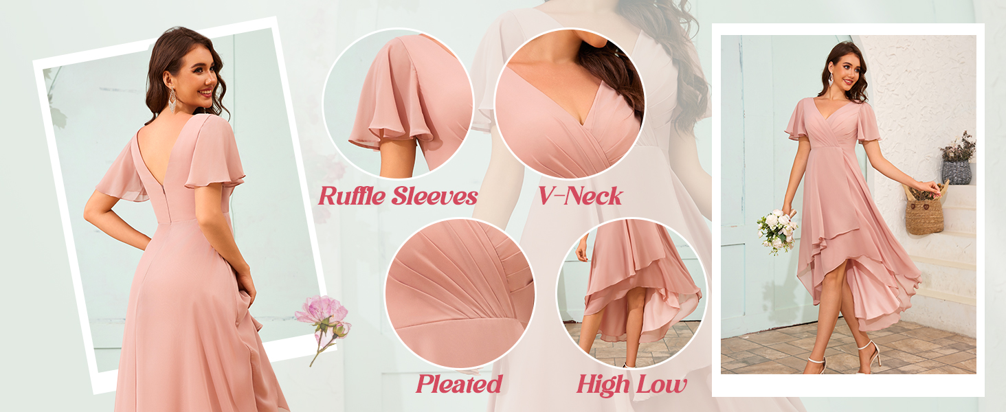 • Features: This elegant chiffon short bridesmaid dress features v neckline,short ruffle sleeves,pleated,a-line,high low,knee length.We have 30+ hot colors for your choice.This chiffon dress is suitable for your different occasions.