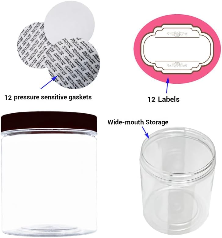 • VALUE PACK:You will get 12pcs clear8 ounces plastic cosmetic jars with black lids and 12pcs labels.extra 12pcs pressure sensitive gaskets
