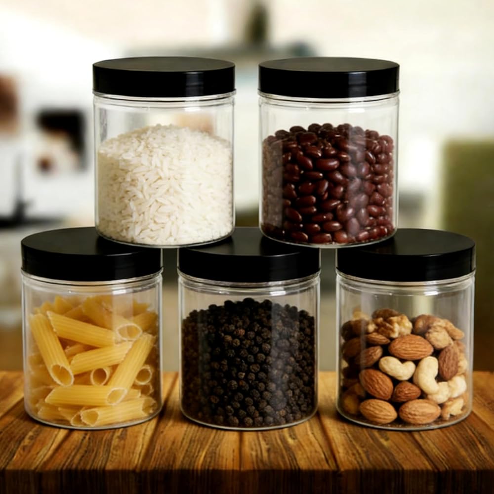 This clear plastic round storage jar also can be applied to fill solid products.