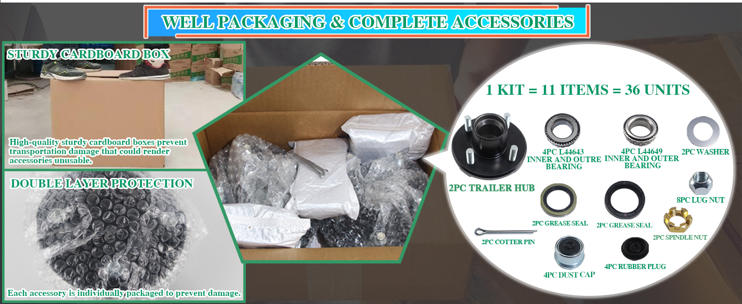 التعبئة الجيدة: يتم تعبئة محاور المقطورة في غلاف فقاعي. يتم تجميع المحامل وأختام الزيت مسبقًا على المحور. يتم تعبئة ملحقات التثبيت الأخرى في غلاف فقاعي أبيض. يتم وضع جميع العناصر بدقة في صندوق من الورق المقوى القوي. قم بحماية المنتج قدر الإمكان أثناء النقل لمنع التشوه الذي قد يجعله غير صالح للاستخدام.