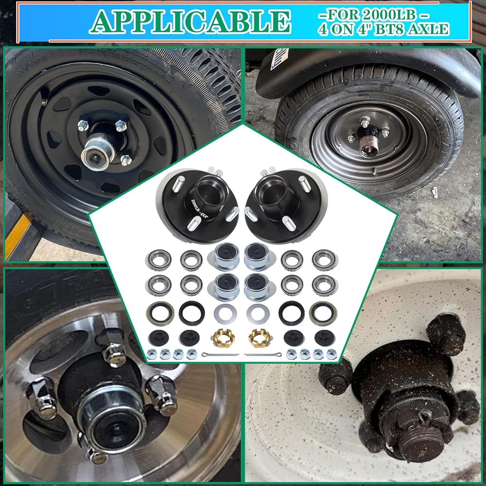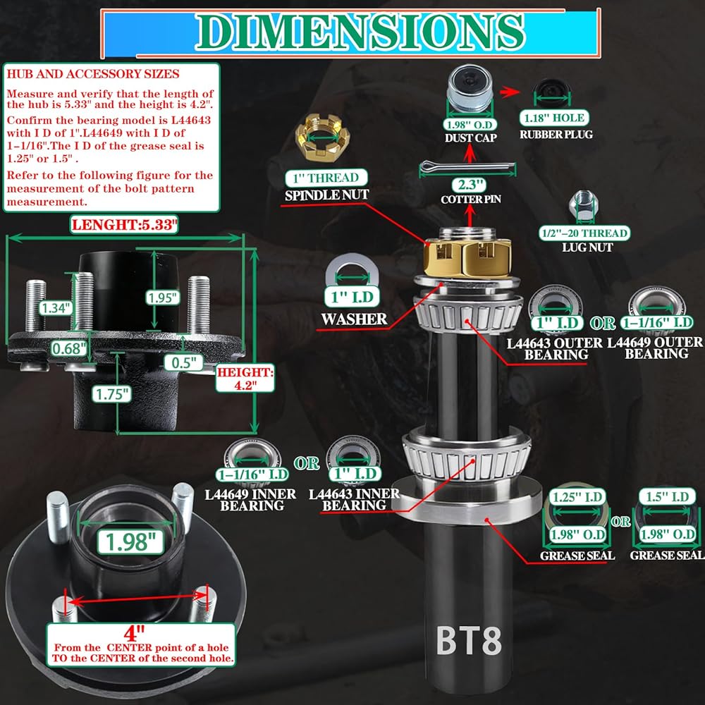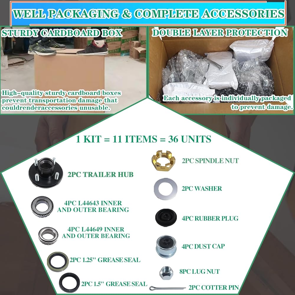 تشتمل على مجموعة كاملة من الملحقات - تتضمن مجموعة محور المقطورة المكونة من 4 قطع 36 قطعة من الأجزاء: قطعتان من المحاور (الطول 5.33 بوصة، الارتفاع: 4.2 بوصة) 4 قطع محامل L44643، 4 قطع محامل L44649، قطعتان من أختام الشحوم السوداء (ID1.5 بوصة)، قطعتان من أختام الشحوم (ID1.25 بوصة)، 8 قطع صواميل العروة ، 2 قطعة دبابيس كوتر، 4 قطعة أغطية غبار (OD: 1.98 بوصة)، 4 قطعة سدادات مطاطية، وقطعتين إضافيتين من صواميل المغزل و2 قطعة من غسالات العمود. مناسبة لعمود دوران مستقيم 1 بوصة OD BT8 (محمل L44643 ID 1 بوصة) أو عمود دوران مستقيم BTR 1-1/16 بوصة OD (محمل L44649 ID 1-1/16 بوصة).