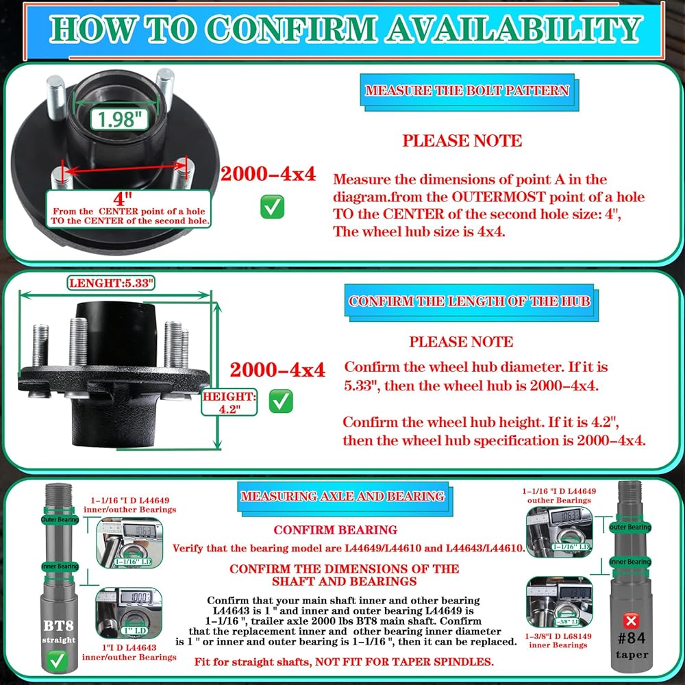 تنطبق على: يناسب محور مقطورة 4 على 4 بوصات بوزن 2000 رطل. يناسب 1-1/16 بوصة أو 1 بوصة #84 مغزل مستقيم. مع 1.25 بوصة معرف و1.5 بوصة ختم شحم معرف، 4 قطع محامل L44649 و4 قطع محامل L44643. يرجى التحقق من أبعاد المغزل قبل تقديم الطلب.