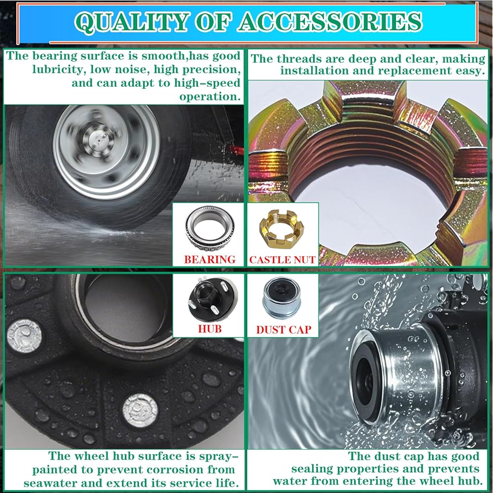 جودة الملحقات: يتضمن مجموعة كاملة من قطع غيار محور العجلة. المحور مصنوع من الفولاذ الكربوني عالي الجودة مع طلاء أسود على السطح، والذي يمكن أن يمنع التآكل والصدأ بشكل فعال، قوي ومتين، مع عمر خدمة طويل. المحمل مصنوع من الفولاذ المحمل عالي الجودة مع تآكل منخفض، الحد الأدنى من الاهتزاز، ضوضاء منخفضة، ختم مزدوج الشفة، لا تسرب.