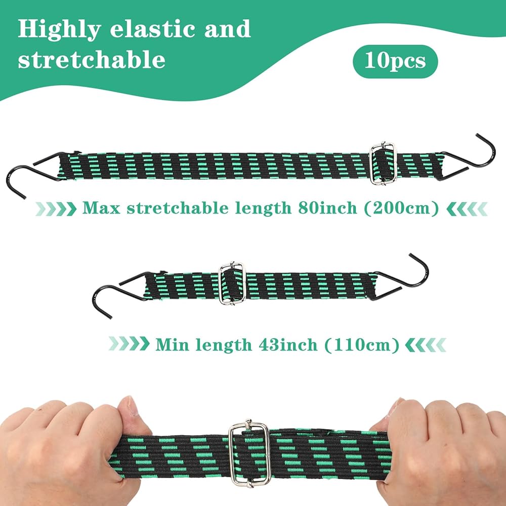 • 【Adjustable Length】Featuring a metal buckle, these adjustable bungee cords can be easily shortened to secure items of different sizes. The elastic core allows the strap to stretch, providing constant tension to keep your cargo, luggage, or a tarp securely fastened without coming loose during transport