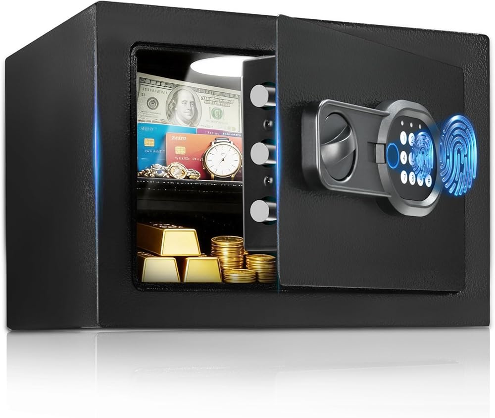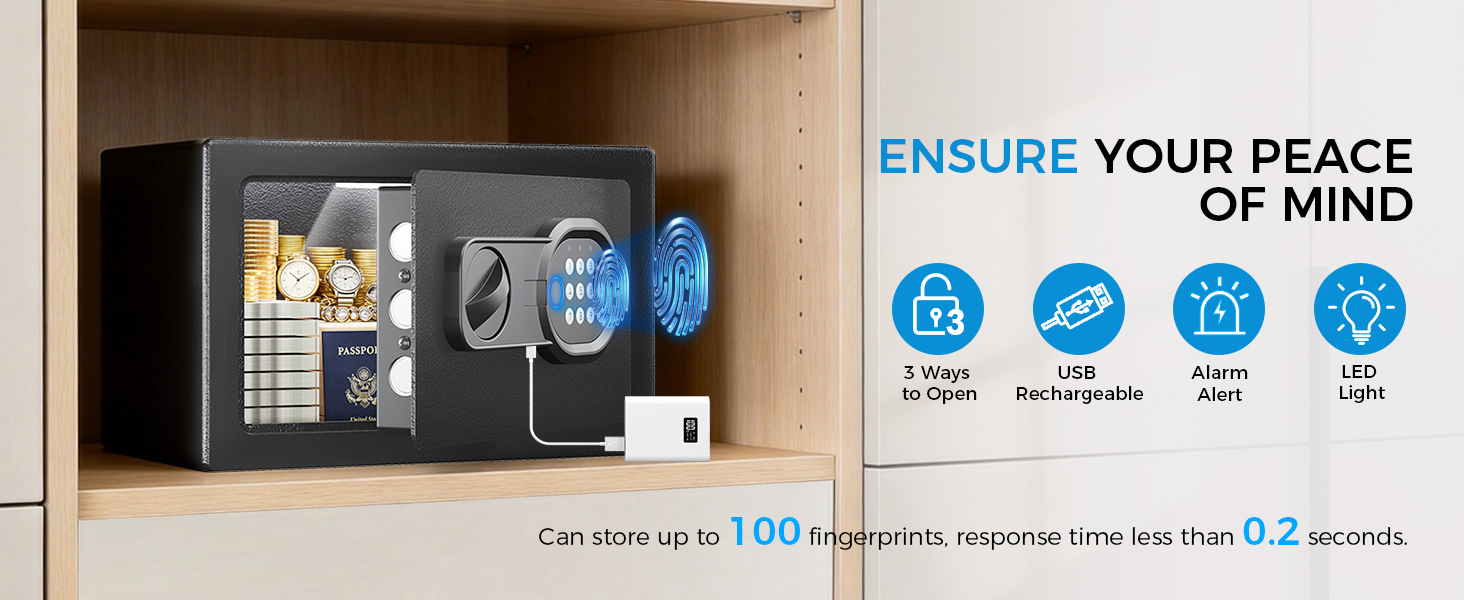 🔓 ثلاث طرق للفتح وقابلة لإعادة الشحن عبر USB توفر هذه الخزنة ثلاثة خيارات سهلة الوصول: بصمة الإصبع ورمز المرور الشخصي ومفاتيح الطوارئ (2 متضمنة). وهو يدعم الشحن في حالات الطوارئ USB من النوع C لتجنب الإغلاق بسبب البطاريات الفارغة.