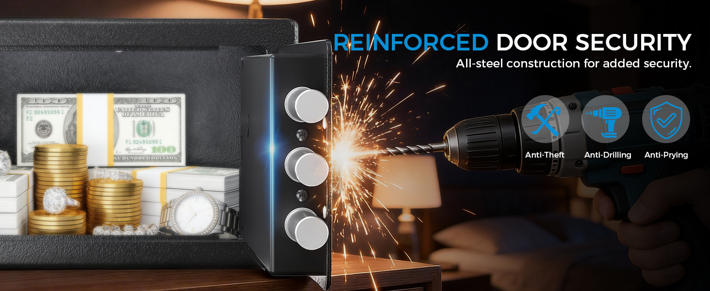 🚨 نظام تنبيه ذكي للسلامة تنبيه انخفاض البطارية: بعد فتح القفل بكلمة مرور أو بصمة الإصبع، يومض المؤشر الأحمر 5 مرات مع 5 أصوات تنبيه لتذكيرك بإعادة الشحن. تحذير بكلمة مرور غير صحيحة: بعد ثلاث محاولات غير صحيحة، يطلق النظام إنذارًا لمدة 20 ثانية مع ضوء أحمر وامض وصافرة تحذير، يتم خلالها قفل لوحة المفاتيح مؤقتًا لمزيد من الأمان.