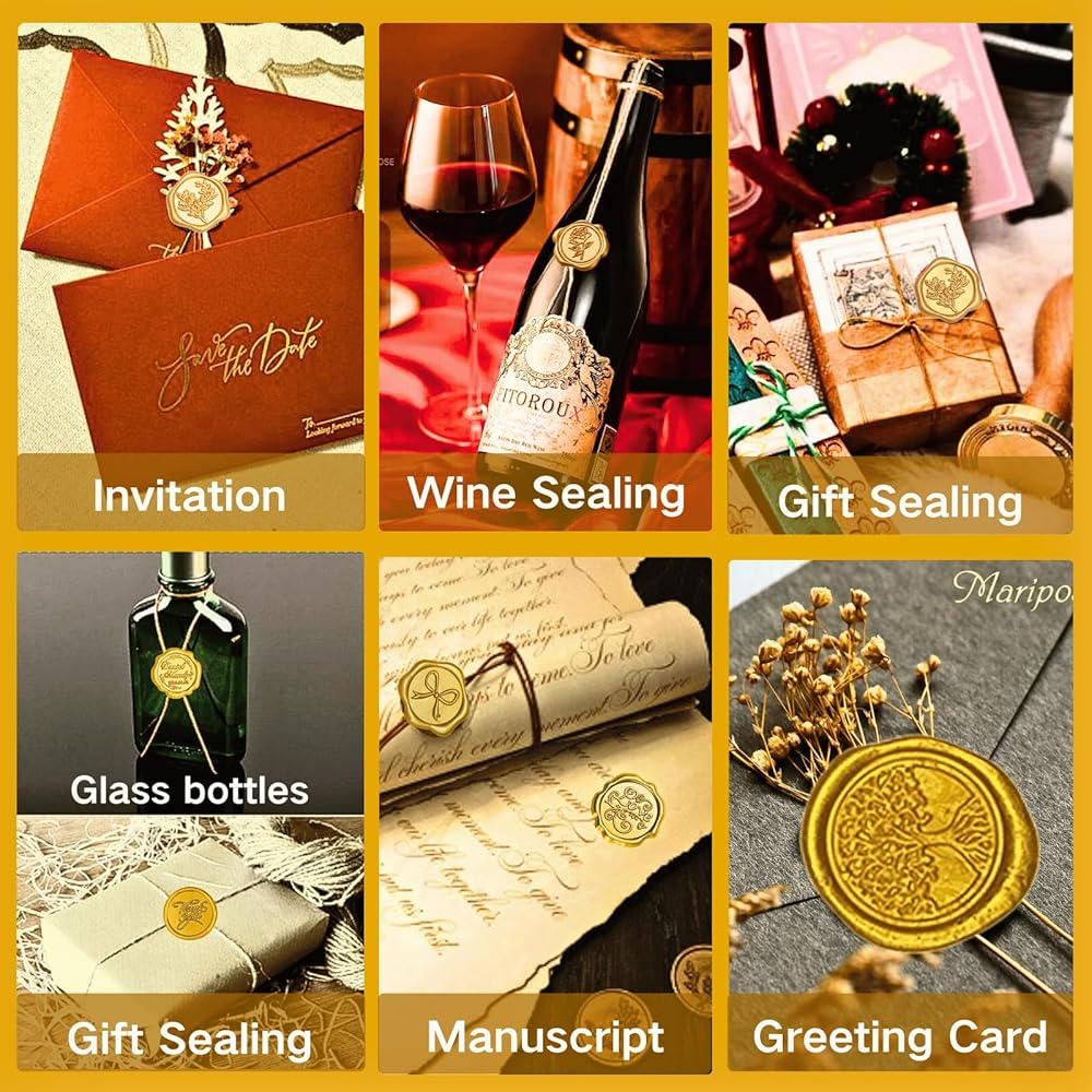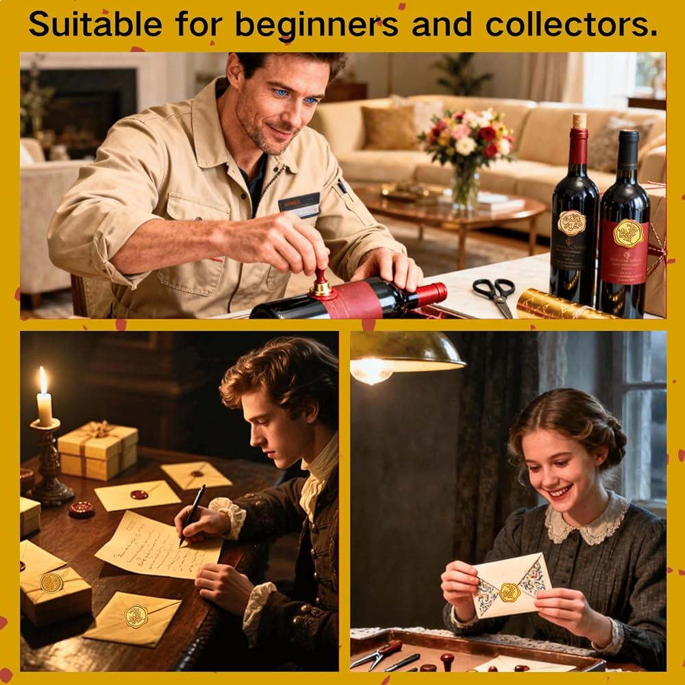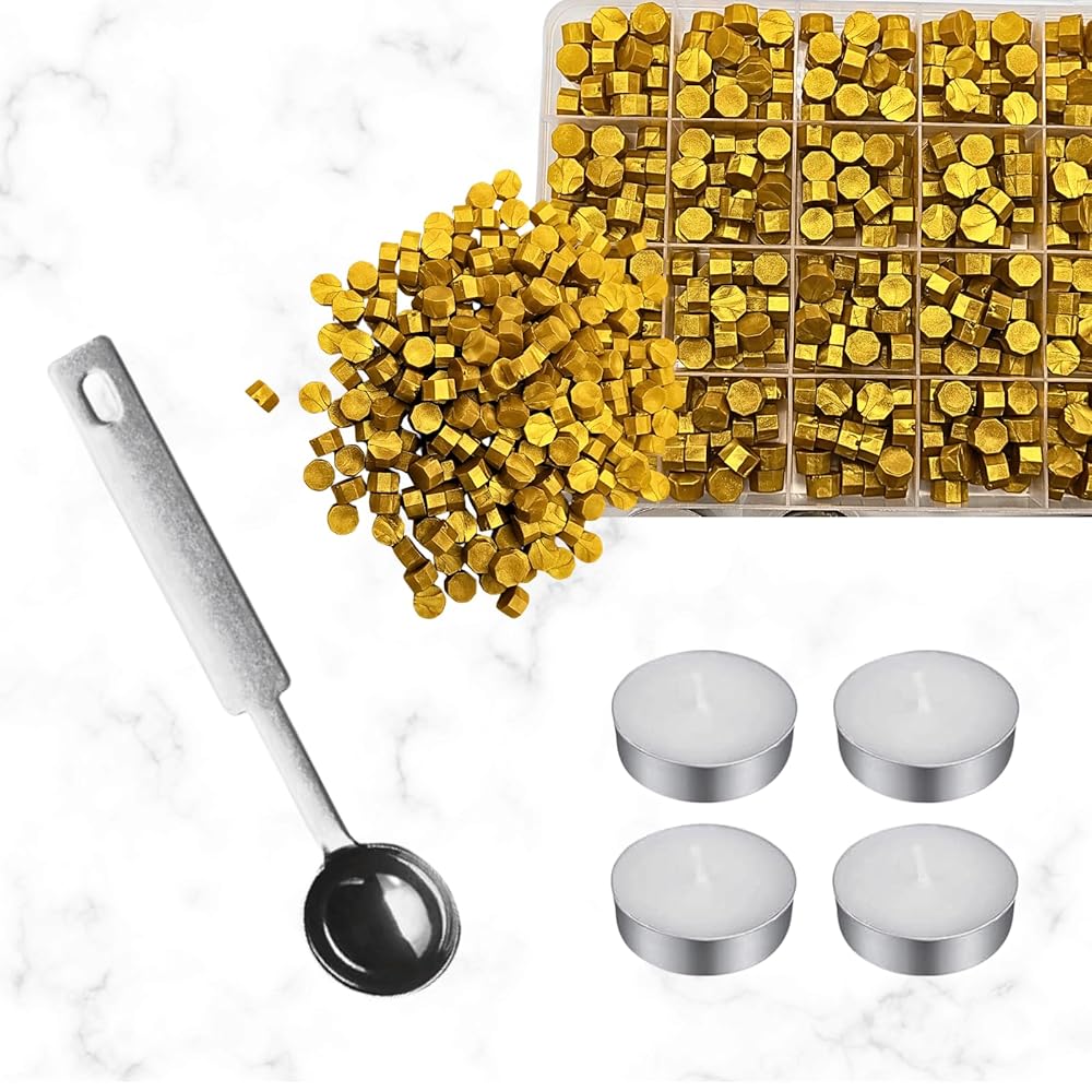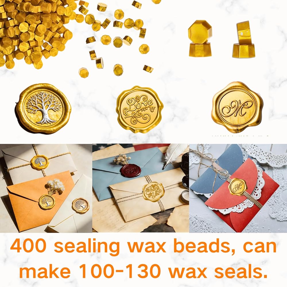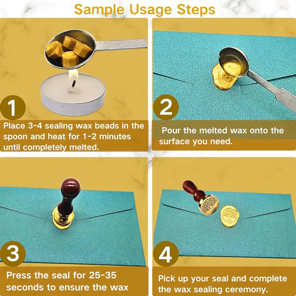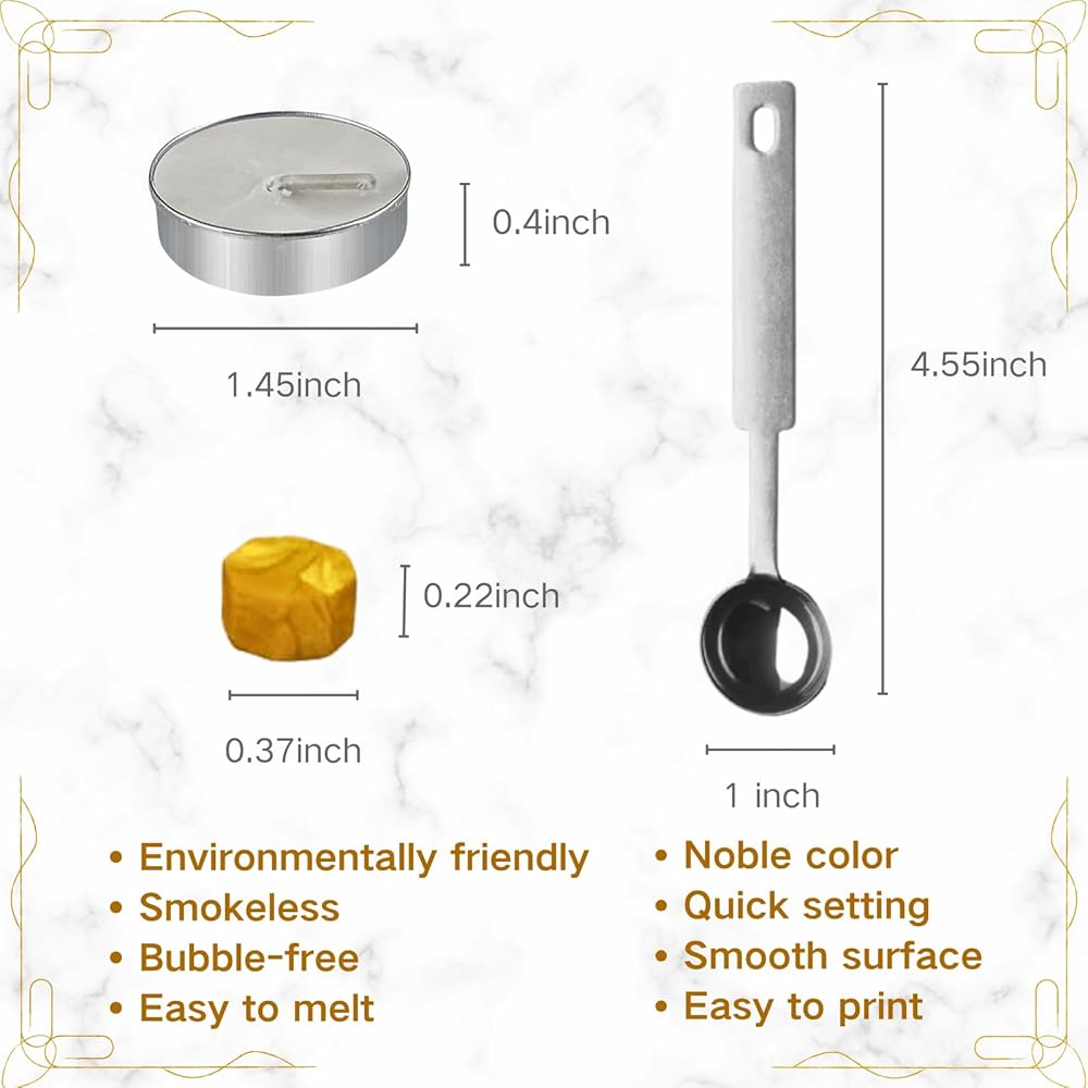 مجموعة ختم الشمع الكاملة: تتضمن 400 خرزة شمع ذهبية فاخرة، وملعقة ذوبان متينة من الفولاذ المقاوم للصدأ مع مقبض مقاوم للحرارة، و4 شموع خفيفة للشاي بطيئة الاحتراق للاستخدام الفوري.