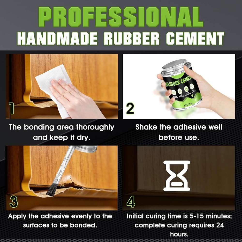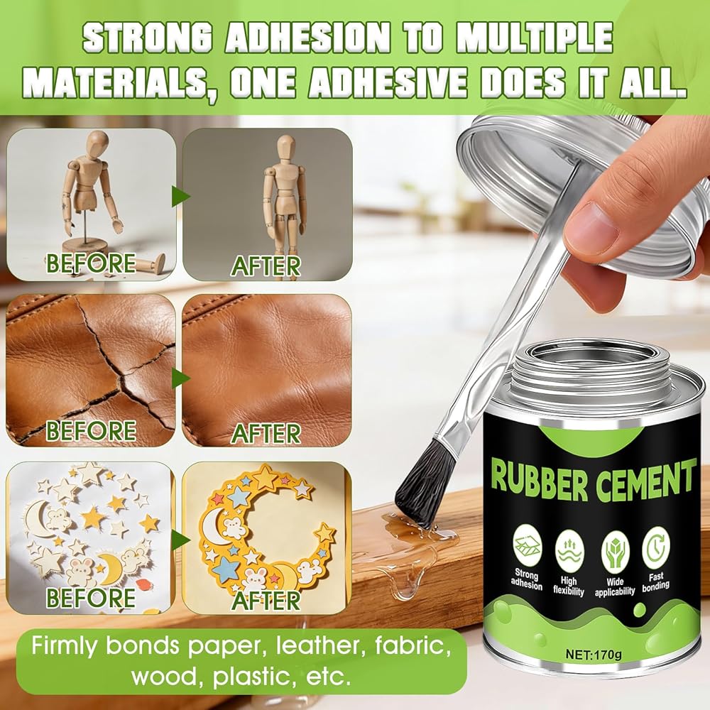 Easy to Use: Ensure both surfaces are clean and dry before applying a thin, even layer of rubber cement glue. Align the two surfaces and gently press them together. Allow to cure completely.