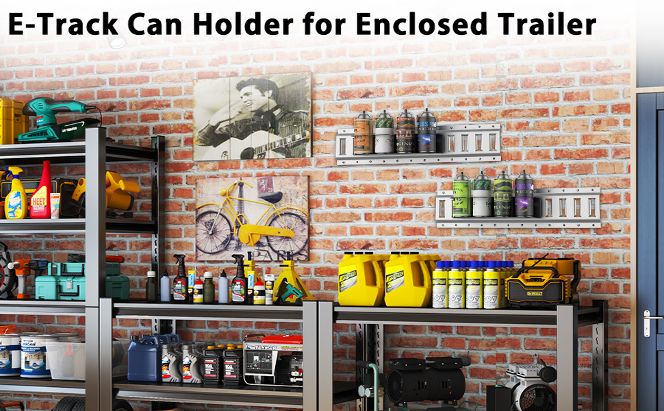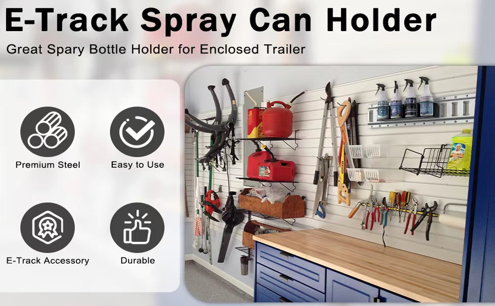 • استخدام واسع: يُعد حامل زجاجات الرش E Track Accessories مثاليًا لحمل زجاجات الرش أو علب الهباء الجوي أو طلاء الرش أو مواد التشحيم، مما يساعد على زيادة المساحة وتقليل الفوضى في المقطورة أو ورشة العمل أو المرآب الخاص بك