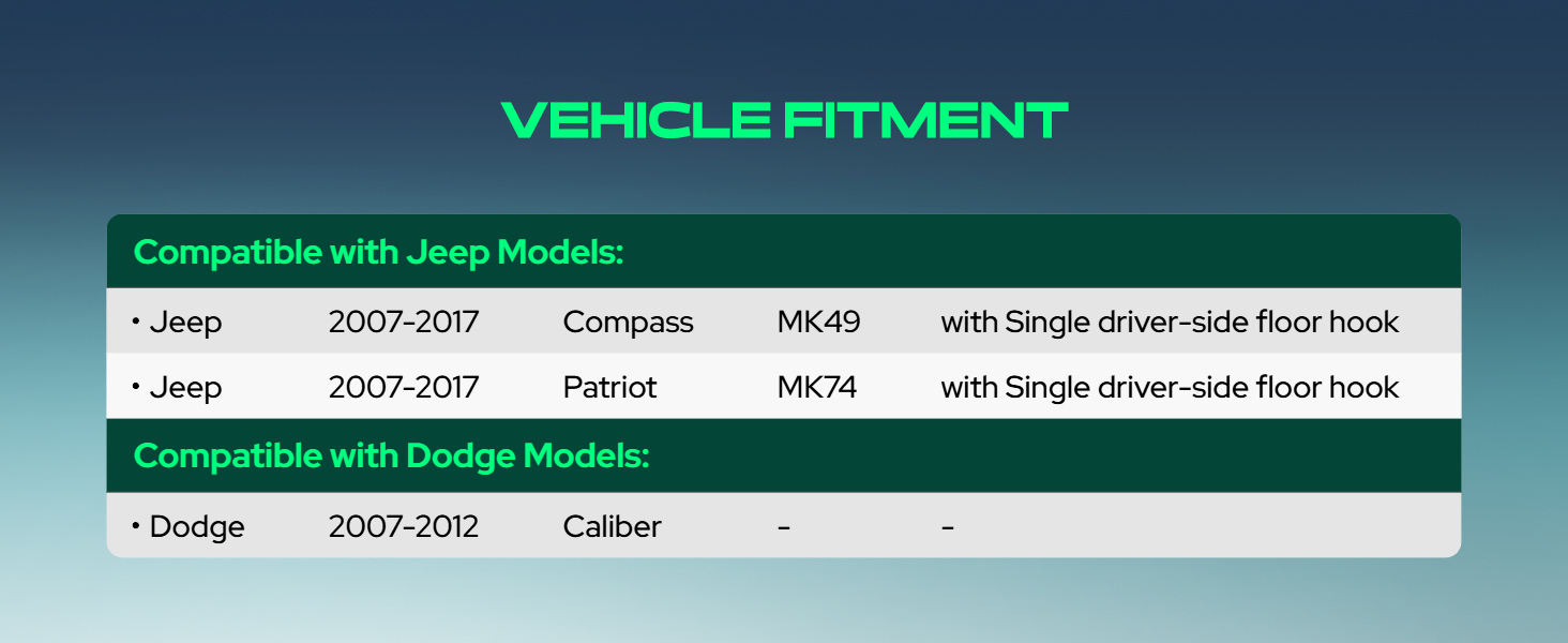 مقاس مخصص: متوافق مع Jeep Compass/Patriot 2007-2017 (يناسب الموديلات ذات الخطاف الأرضي من جانب السائق فقط)؛ متوافق مع دودج كاليبر 2007-2012؛ سجادات أرضية مناسبة لجميع الأحوال الجوية، فهي توفر ملاءمة مثالية وتعزز المظهر العام للسيارة من الداخل. ملاءمة رائعة بمجرد إخراجها من الصندوق