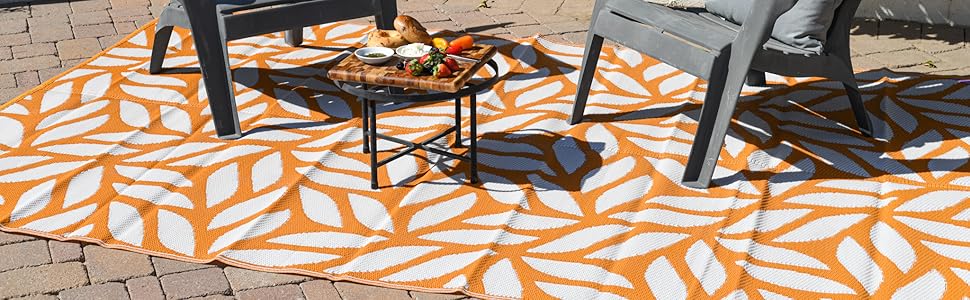 Get ready to spice up your outdoor living area with the Reversible Mats Outdoor Polypropylene Patio Mat in Mango and White Leaf Design. The versatile design can be used indoors or outdoors, whether it's used on your patio, by the pool, picnics, or your laundry room. This mat is reversible and measures (L x W): 9 x 6 feet. Reversible mats are made with high-quality virgin polypropylene built with a woven structure designed to be quick and easy to dry making them breathable. With the breathable design, the mat will not ruin your grass or damage your wooden deck. Move the mat from room to room with a lightweight and foldable design. With a simple flip, you can redecorate with the reversible colors making this a versatile mat for any room. The bright and vibrant colors will not fade with the UV resistant material. Clean the mat hassle-free by sweeping debris or spray down with water. Included in the package is a carry bag making it easy to fold and bring on the go. Bring the colorful mat to your next outdoor picnic or gathering.