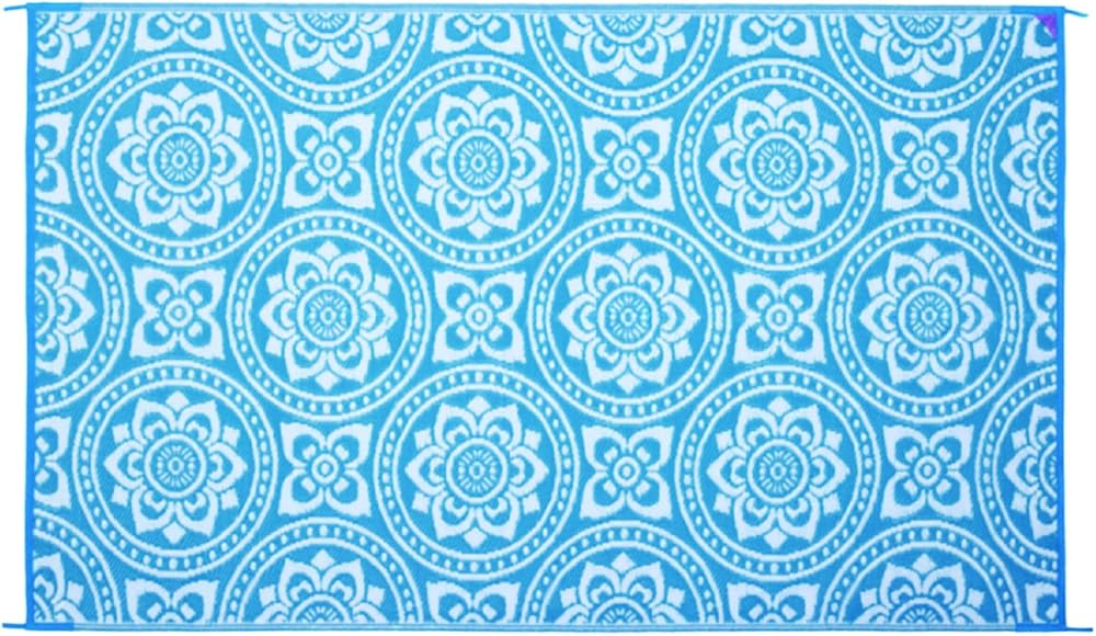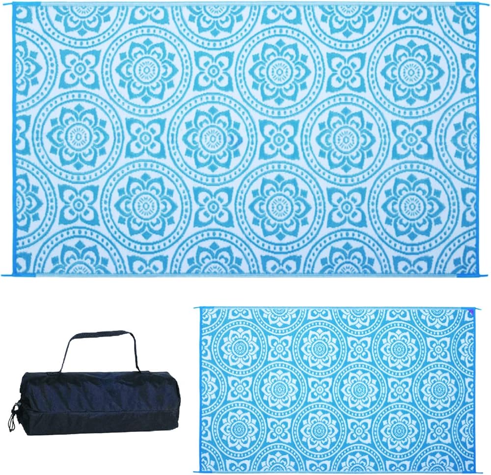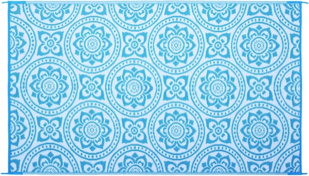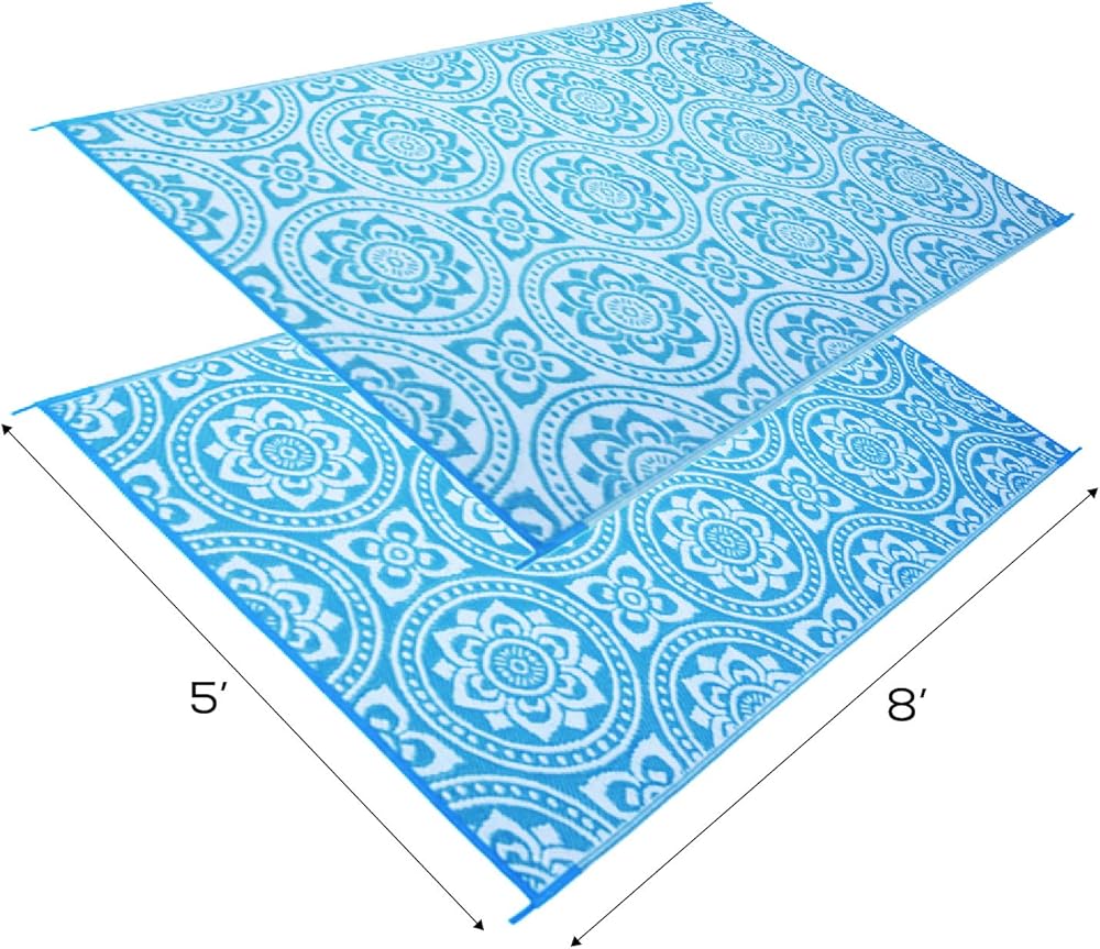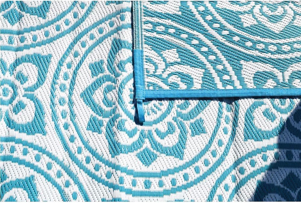 أنيق للتخييم 255083 5 أقدام × 8 أقدام بساط قابل للعكس، سجادة من القش البلاستيكي، سجادة أرضية كبيرة للأماكن الخارجية، عربة سكن متنقلة، فناء خلفي، نزهة، شاطئ، تخييم - حصيرة أوراق الشجر (فيروزي/أبيض)