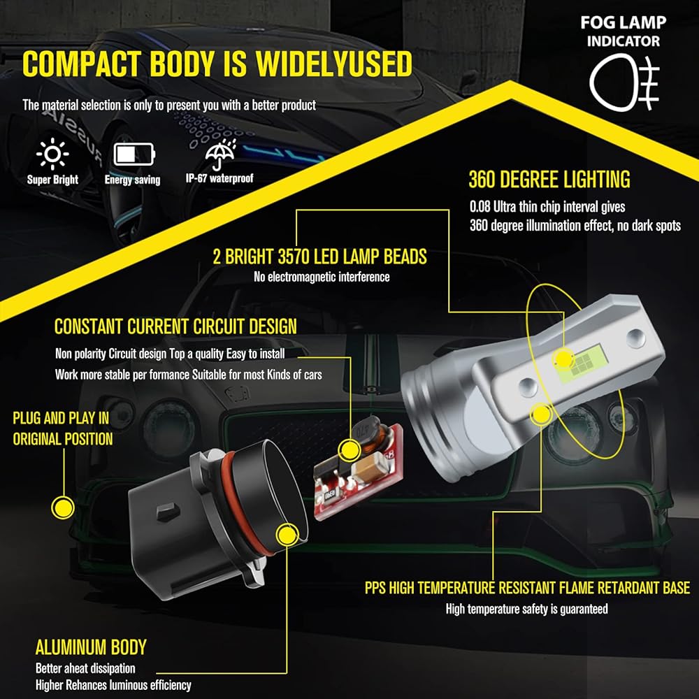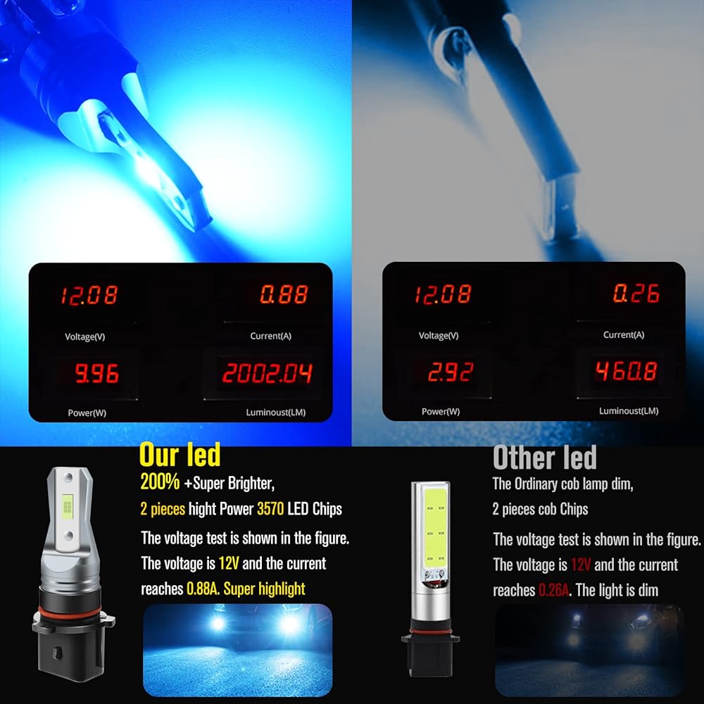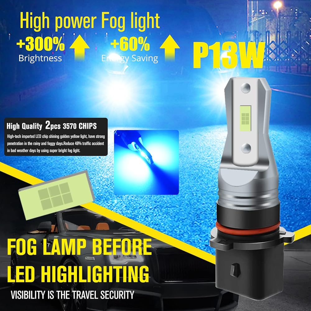 Super Bright P13W Fog Light Bulb:2pcs high power 45mil 5730 SMD chips/bulb;Luminous flux up to 3800LM/pair,360° light,it's 200% brighter than halogen bulb,safer for your driving.