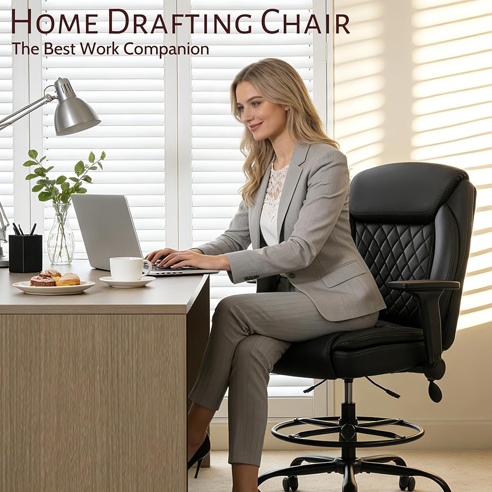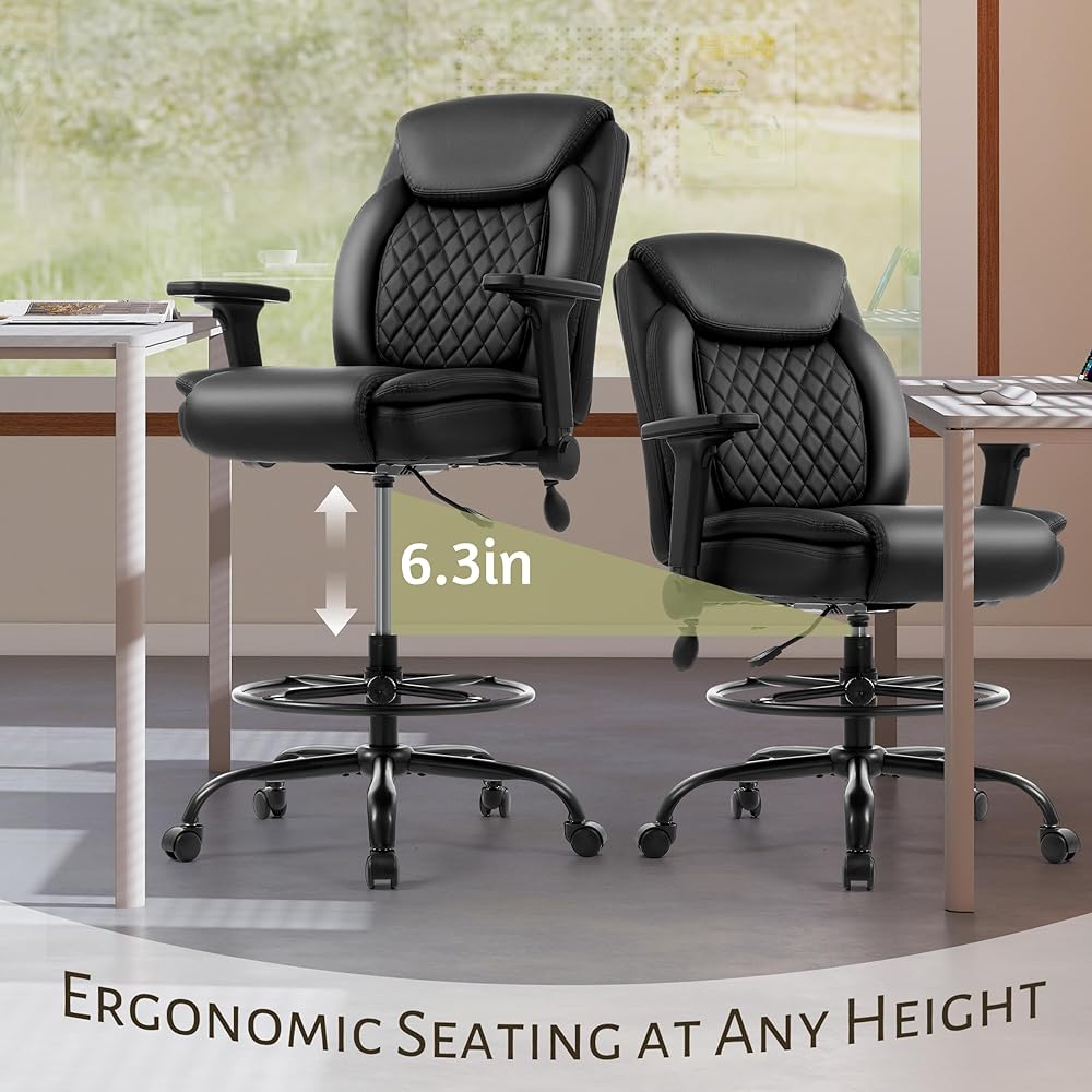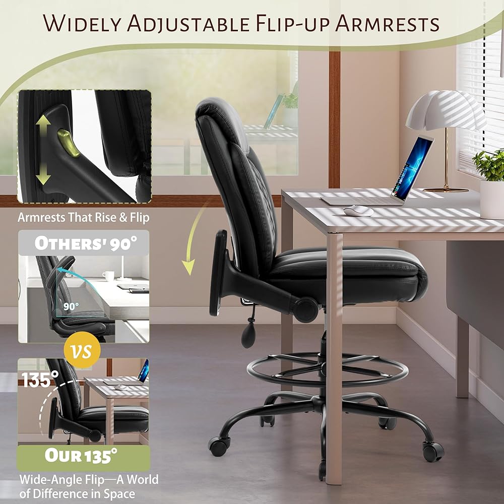 كرسي صياغة، كرسي مكتب طويل القامة، مساند للذراعين قابلة للطي للاستخدام في رسم مكتب الارتفاع، كرسي عالي المهام مع حلقة قدم قابلة للتعديل ودعم قطني قابل للنفخ، مقعد كمبيوتر دوار، أسود من البولي يوريثان