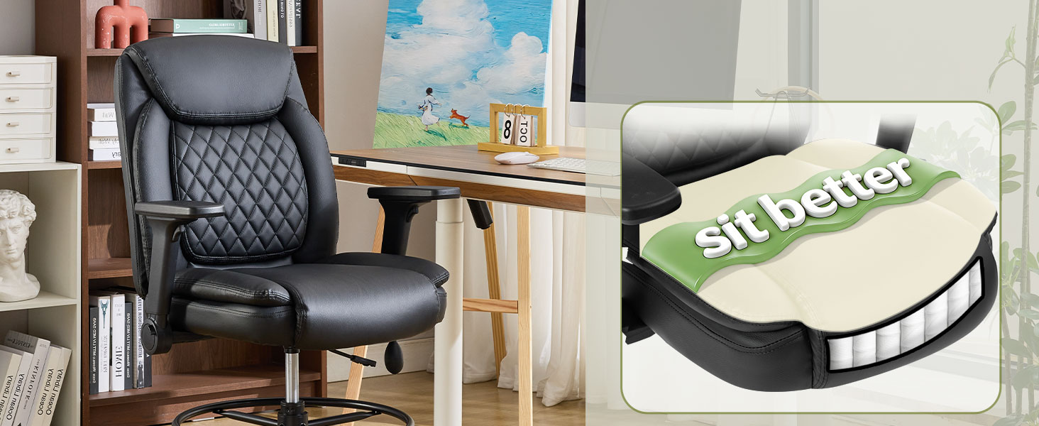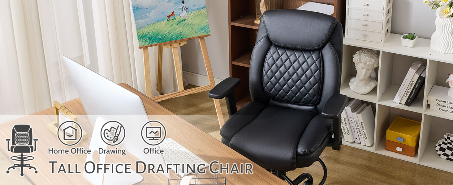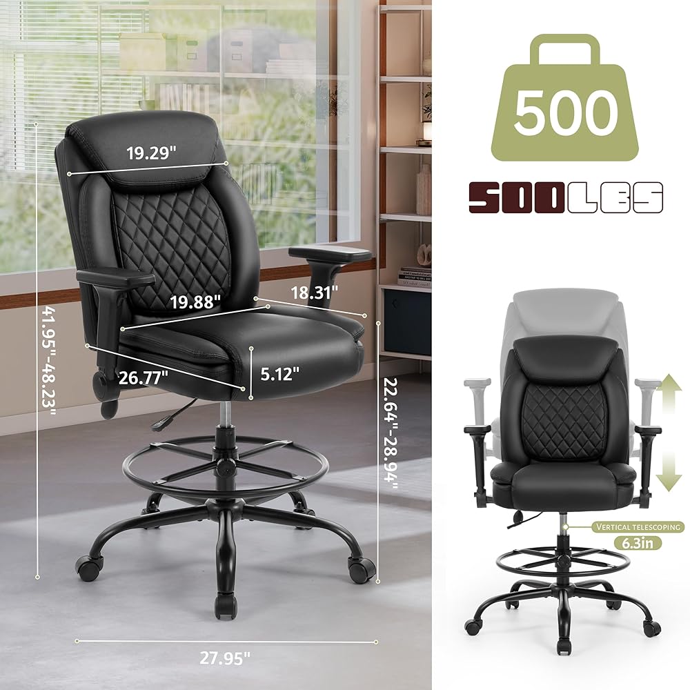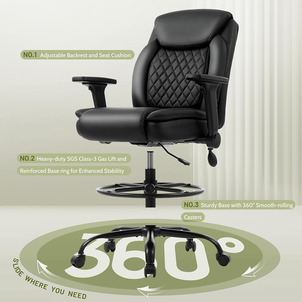 كرسي صياغة، كرسي مكتب طويل القامة، مساند للذراعين قابلة للطي للاستخدام في رسم مكتب الارتفاع، كرسي عالي المهام مع حلقة قدم قابلة للتعديل ودعم قطني قابل للنفخ، مقعد كمبيوتر دوار، أسود من البولي يوريثان