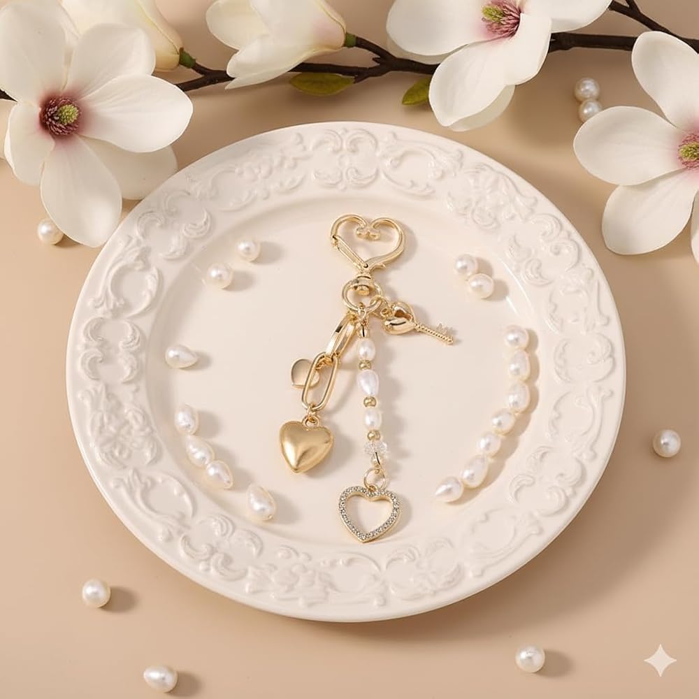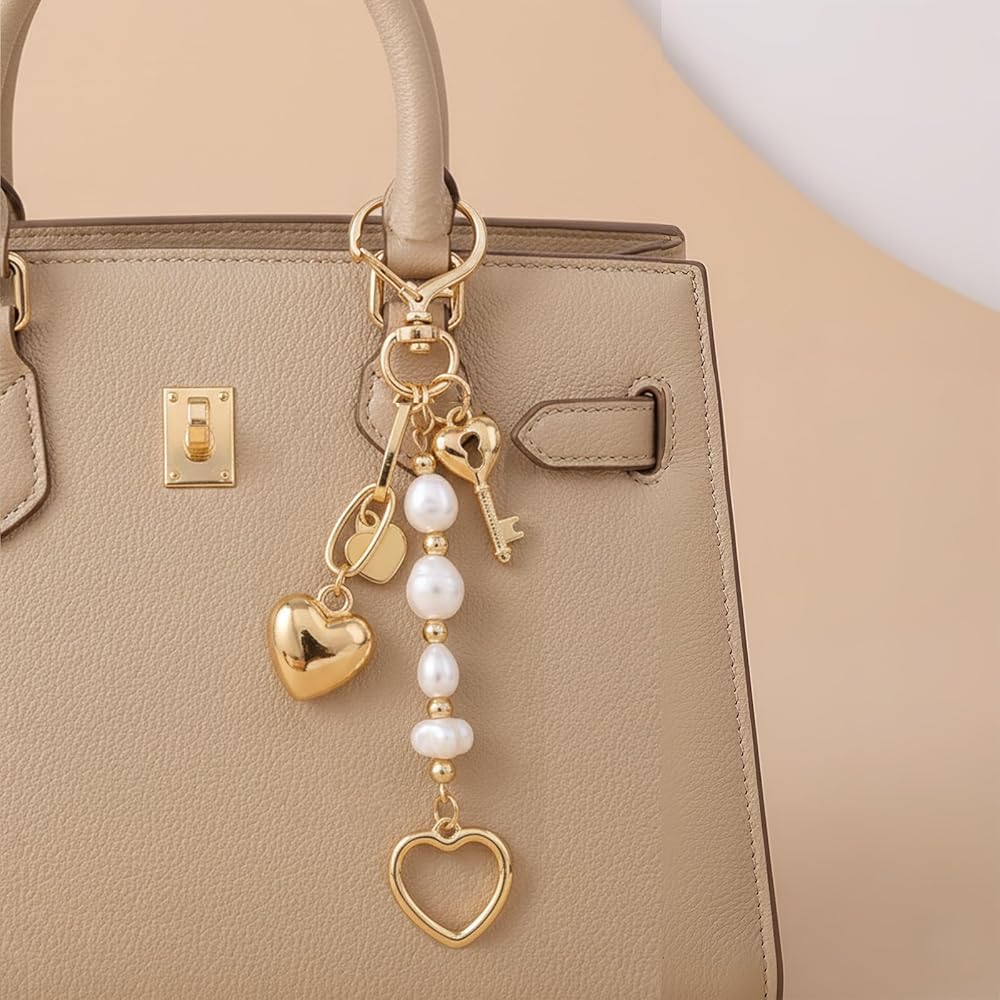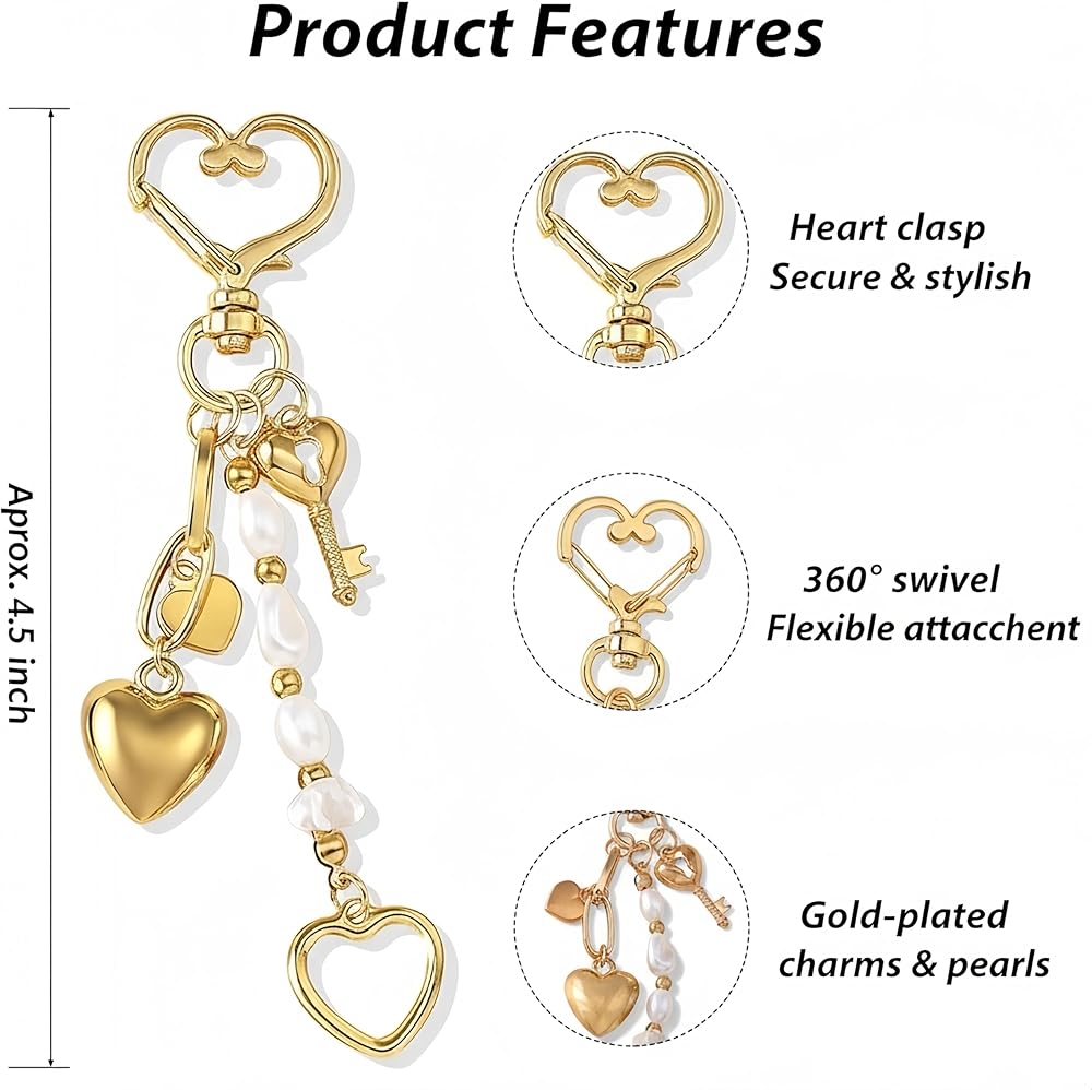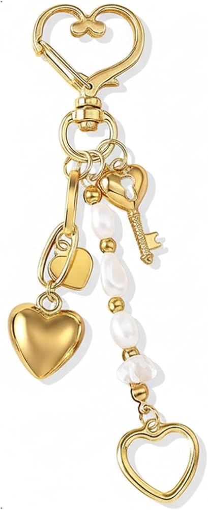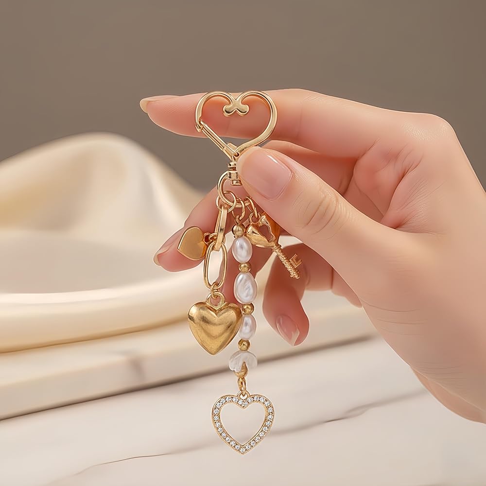 Add a romantic touch to your everyday look with this elegant gold heart keychain. Designed with multiple heart charms, a delicate key pendant, and pearl-like beads, it's perfect as a stylish key ring or purse charm. The heart-shaped clasp makes it easy to attach to handbags, backpacks, or keys. Lightweight, durable, and chic—an ideal accessory or thoughtful gift for someone special.