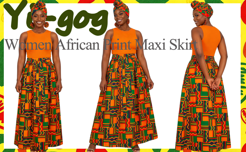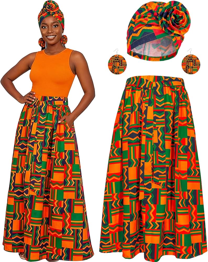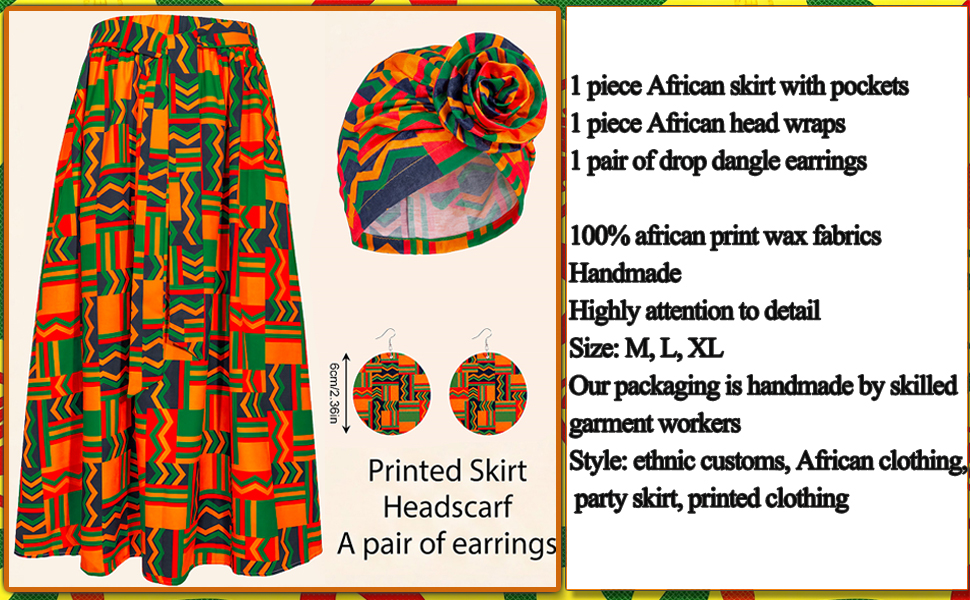 【Complete African Print Outfit Set】This is not just a skirt, but a complete accessory set! It includes 1 African printed maxi skirt, 1 matching Ankara head wrap, and 1 pair of ethnic wooden drop earrings. You get a coordinated, head-turning traditional African look in one convenient purchase.