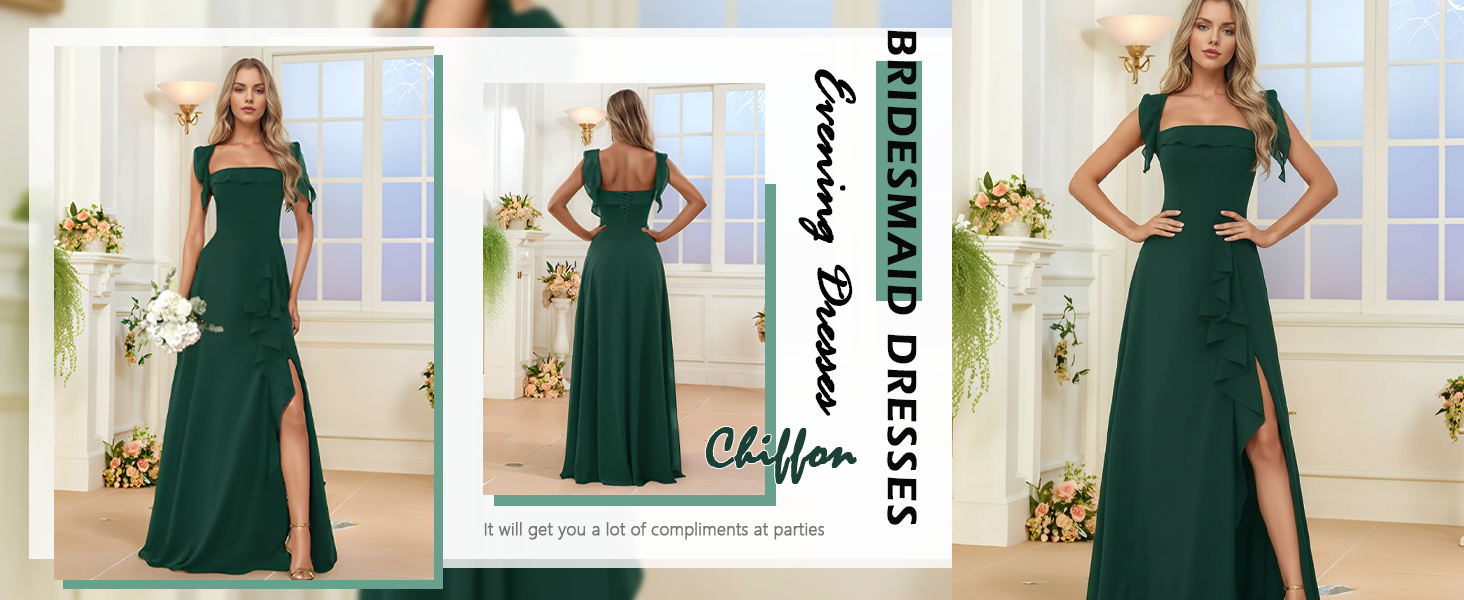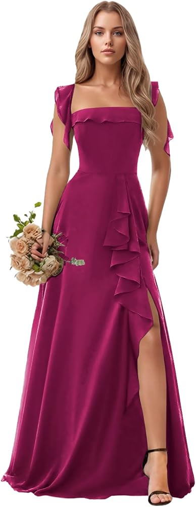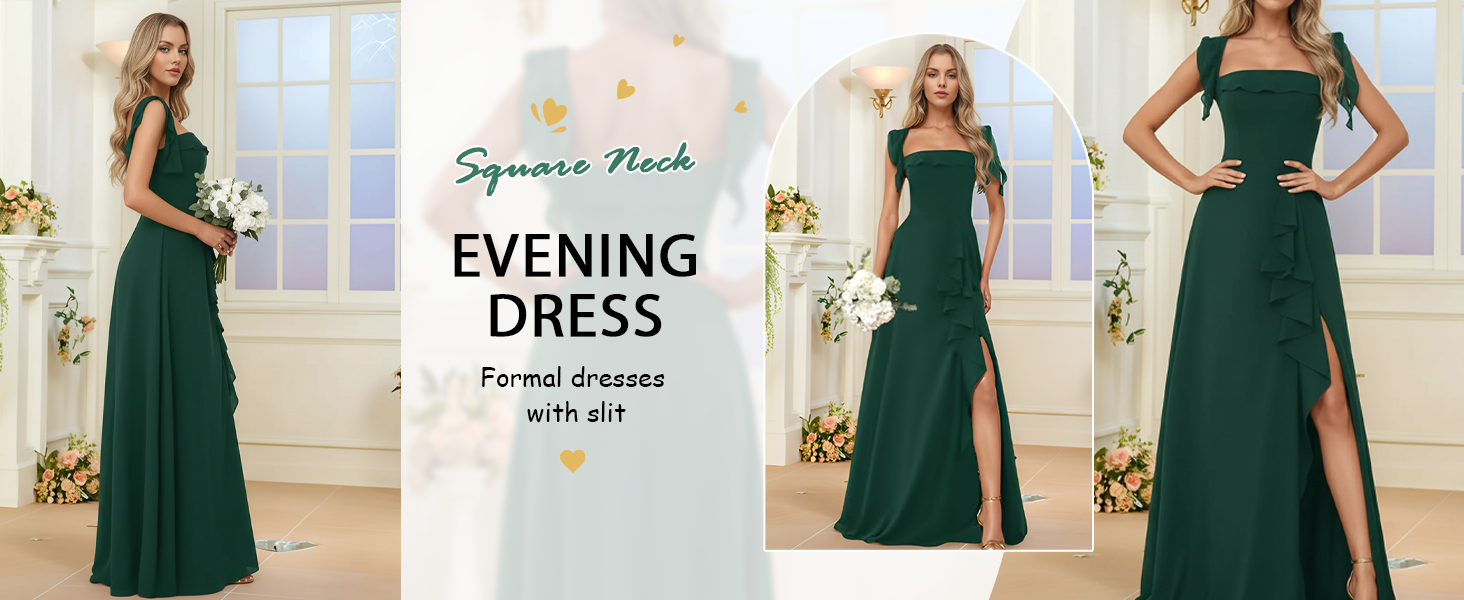 فساتين وصيفة الشرف طويلة فساتين رسمية مكشكشة لضيف حفل الزفاف فساتين سهرة شيفون برقبة مربعة مع فتحة in Kuwait