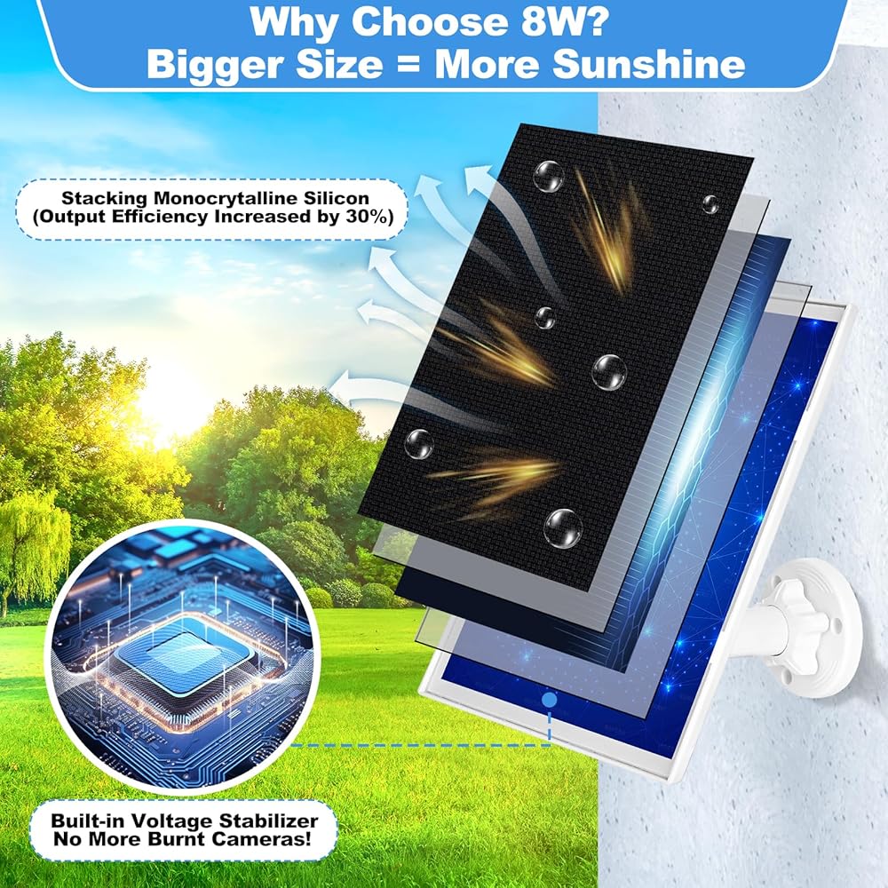 • 【شاحن الطاقة الشمسية الدائري بقوة 8 واط 】شحن أسرع بنسبة تصل إلى 30% من الألواح 5 واط! يستخدم هذا الشاحن الشمسي للكاميرا الحلقية بقدرة 8 واط السيليكون أحادي البلورية المتميز لتوصيل الطاقة بكفاءة، حتى في الضوء المتغير. ضروري لكاميرات Ring المتعطشة للطاقة. منظم الجهد المتكامل يحمي صحة بطارية الكاميرا