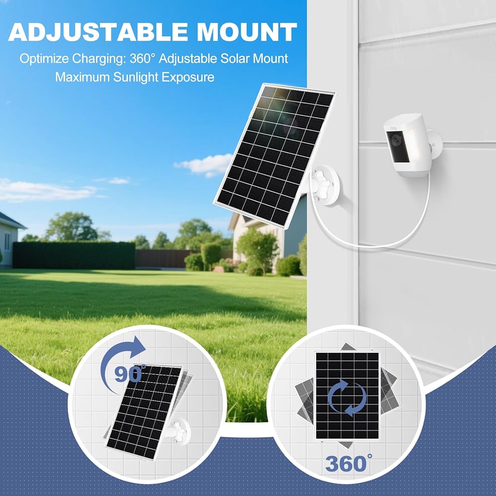• 【طاقة شمسية 24/7 للمراقبة الحلقية】تأكد من أن كاميرات Ring الأمنية (الكاميرا الخارجية (كاميرا لاصقة)، كاميرا خارجية بلس، كاميرا Stick Up Cam Pro، كاميرا خارجية (كاميرا لاصقة) الجيل الثاني/الثالث، بطارية كاميرا Spotlight Cam/Pro/Plus) لا تفوت أي لحظة. تستغل اللوحة الشمسية Ring الشمس لتوفير طاقة موثوقة للمراقبة المستمرة، مما يطيل عمر البطارية بشكل كبير في الظروف المشمسة. ⚠️ لكاميرات Ring BATTERY فقط (ليس للطرز السلكية/التي لا تحتوي على بطارية)